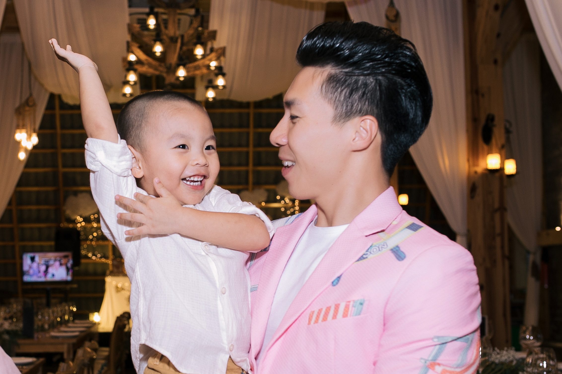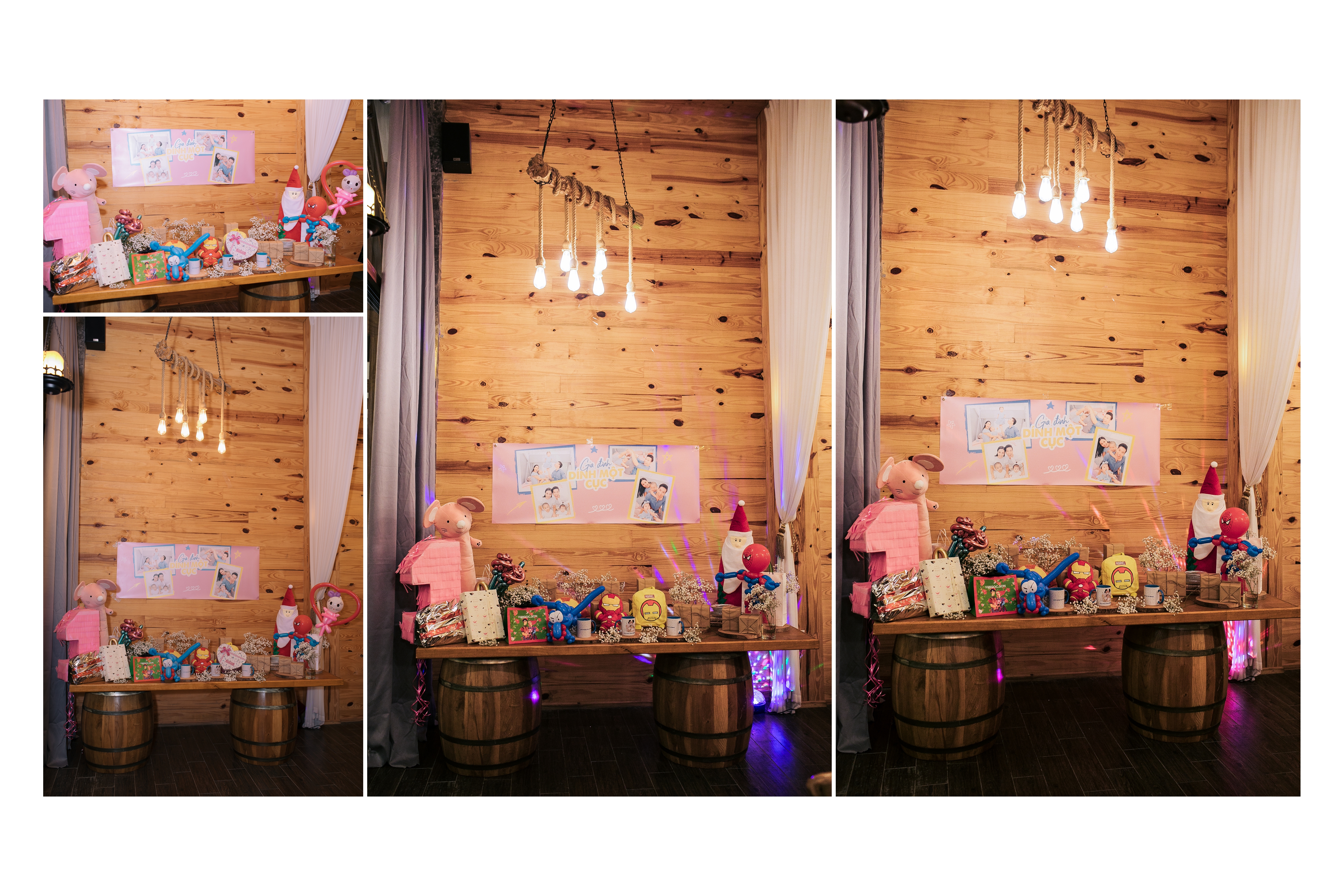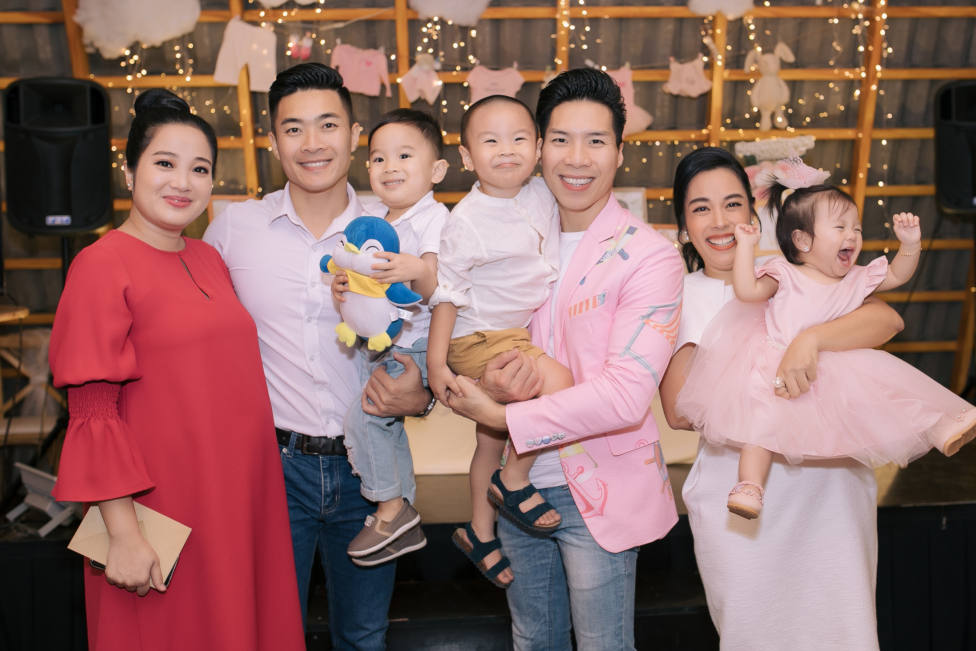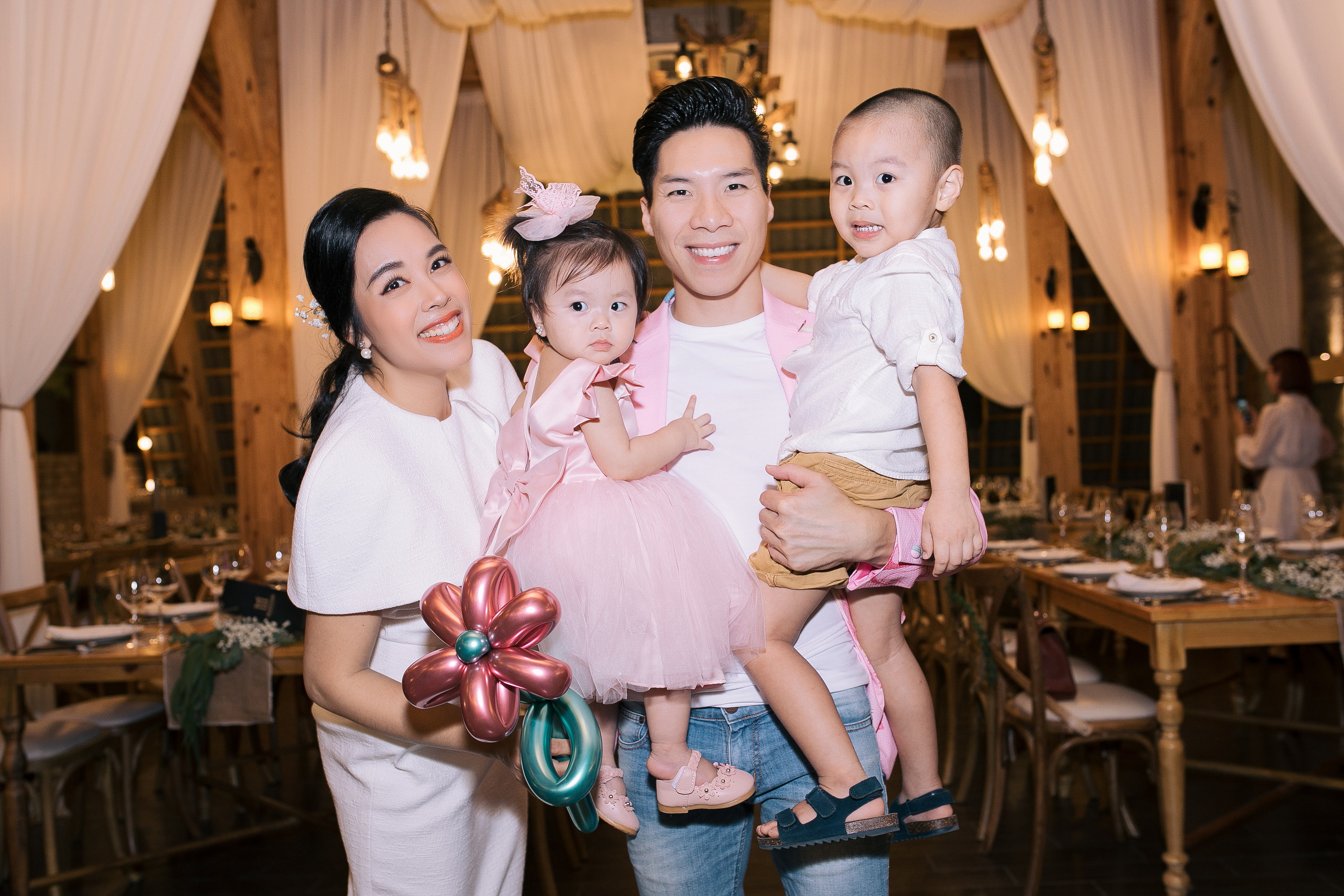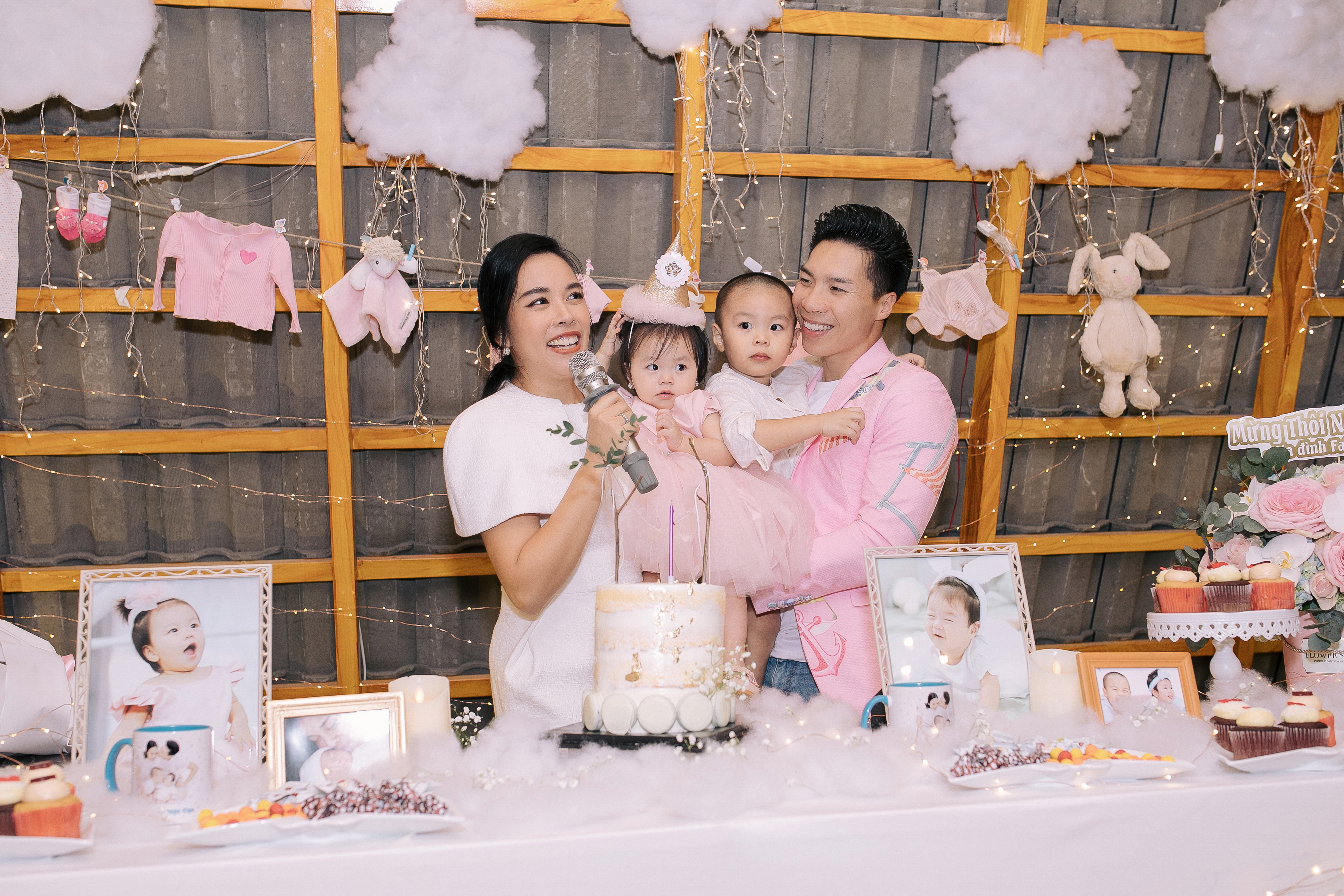 Buổi tiệc nhỏ diễn ra trong không gian ấm áp, được bà xã Ngọc Mai và những người thân tự tay trang trí với những vật dụng gần gũi, giản dị nhưng không kém phần tinh tế với tông màu hồng chủ đạo, màu mà bé Mì Mí Tâm An yêu thích. Tất cả toát lên sự chăm chút tỉ mỉ với đong đầy tình cảm mà cả gia đình “Dính một cục” dành cho cô công chúa nhỏ.
