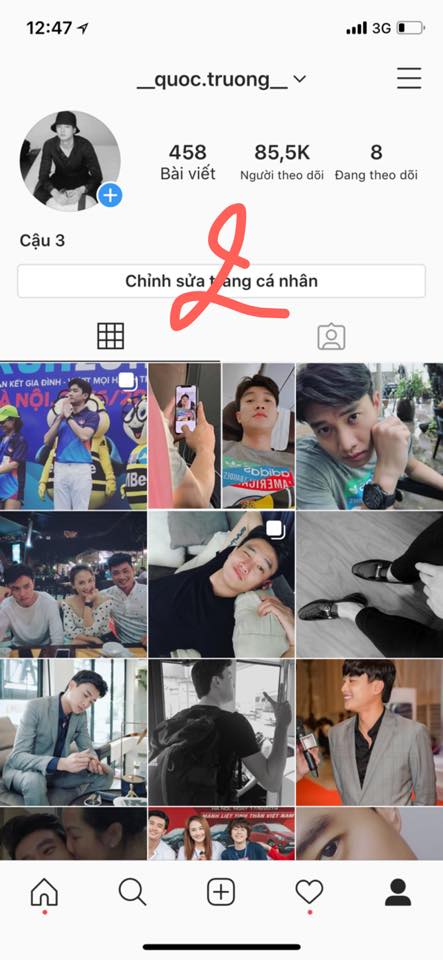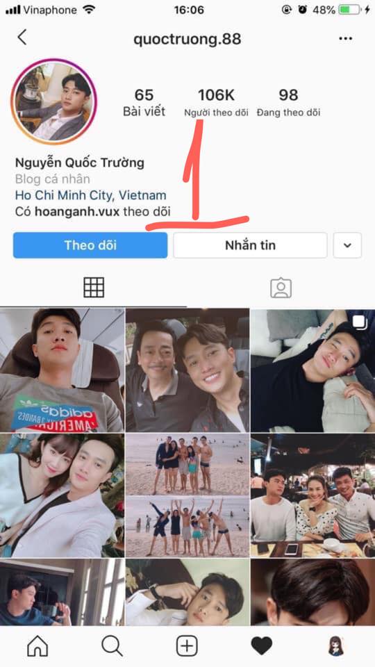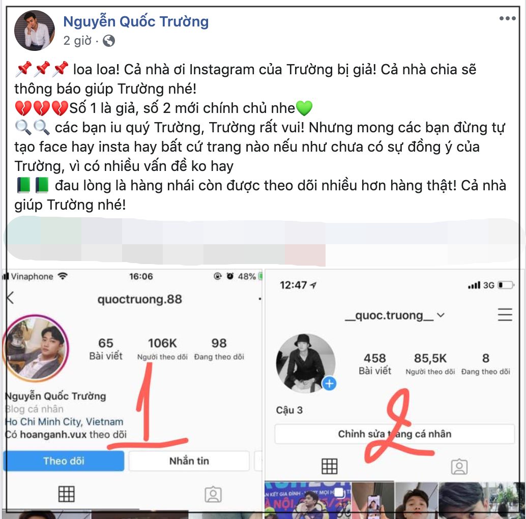 Anh than thở: ”Loa loa! Cả nhà ơi Instagram của Trường bị giả! Cả nhà chia sẽ thông báo giúp Trường nhé! Số 1 là giả, số 2 mới chính chủ nhé.