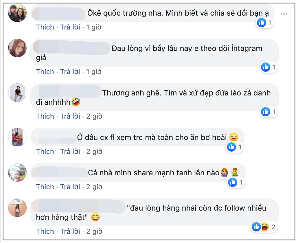 Nhiều khán giả đã không giấu nỗi sự buồn cười khi chứng kiến cảnh tréo ngoe: IG giả lại còn nhiều followers hơn IG thật. Đáp lại lời kêu gọi của Vũ sở khanh, nhiều cư dân mạng đã chia sẻ bài viết này để cảnh báo. Bên cạnh đó, fans cũng hò nhau report IG giả mạo kia. Quả là Quốc Trường đang sở hữu những fan hâm mộ rất chân chính, có tâm!
