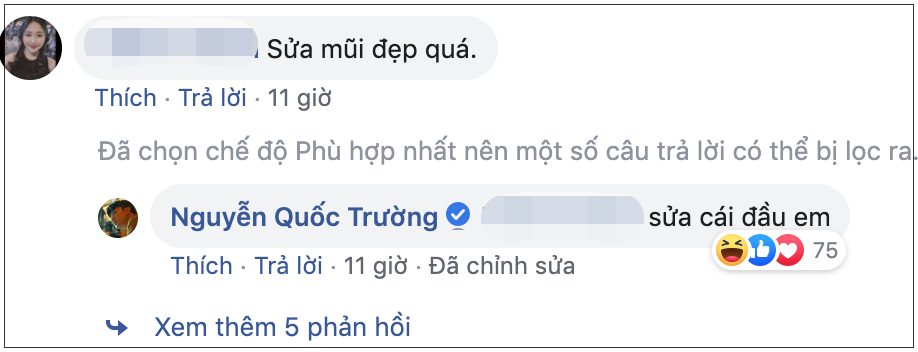 Tức thì, các fan nữ đã thi nhau vào bình luận. Có một fan comment bảo Quốc Trường sửa mũi đẹp quá, ngay lập tức anh ”đanh đá” phản hồi: ”Sửa cái đầu em”.