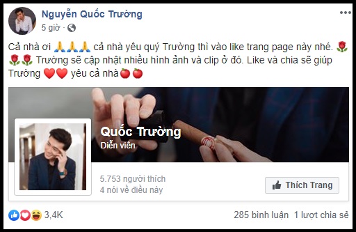 Về phía mình, Quốc Trường hiện vẫn giữ im lặng. Nhưng trên Facebook, anh vẫn thoải mái đăng tải status cũng như là giao lưu với fans hâm mộ.