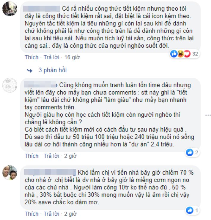 Theo đó những người này cho rằng công thức trên là không hợp lí, nếu tiết kiệm kiểu này thì bạn sẽ không thể mua được nhà cửa, đất đai hay tài sản gì quá lớn trong vòng 10 năm và cuộc sống của bạn sẽ không có gì đột biến hay nói theo cư dân mạng là “nghèo suốt đời”.