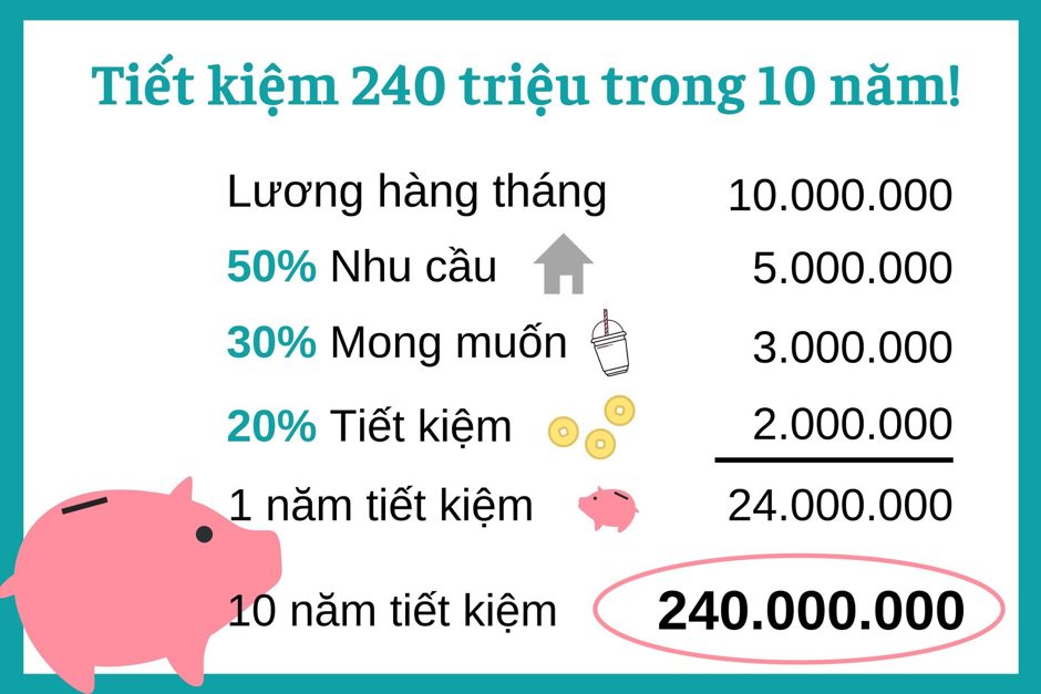 Một quy tắc phổ biến và dễ nhớ là 50/30/20. Theo đó, bạn chia tiền lương của mình như sau: 50% cho nhu cầu, 30% cho mong muốn và 20% cho tiết kiệm. Một người kiếm 10 triệu/tháng có thể tiết kiệm được 240 triệu trong vòng 10 năm chỉ đơn giản bằng cách dành riêng một phần nhỏ lương của mình mỗi tháng! Bạn đã bao giờ cân nhắc bất kỳ phương pháp tiết kiệm nào chưa?”
