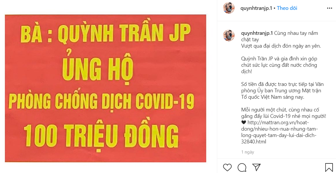 Mới đây, Quỳnh Trần cùng ông xã người Nhật đã quyên góp 100 triệu đồng cho quỹ chống dịch COVID-19 ở Việt Nam. Trên trang Instagram cá nhân, nữ YouTuber chia sẻ bức ảnh kèm dòng trạng thái: “Cùng nhau tay nắm chặt tay vượt qua đại dịch đón ngày an yên. Quỳnh Trần JP và gia đình xin góp chút sức lực cùng đất nước chống dịch! Số tiền đã được trao trực tiếp tại Văn phòng Ủy ban Trung ương Mặt trận Tổ quốc Việt Nam sáng nay”