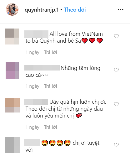 Trước những bình luận quở trách đó, không ít người đã đứng ra bênh vực Quỳnh Trần JP: “Mình nghĩ là Quỳnh chỉ muốn thông báo để mọi người cảm thấy có động lực hơn, ấm áp, tiếp sức về vật chất lẫn tinh thần thôi chứ khoe mẽ gì đâu. Không nói thì bảo là con dân Việt Nam sao không ủng hộ, còn ủng hộ thì bảo khoe?”.