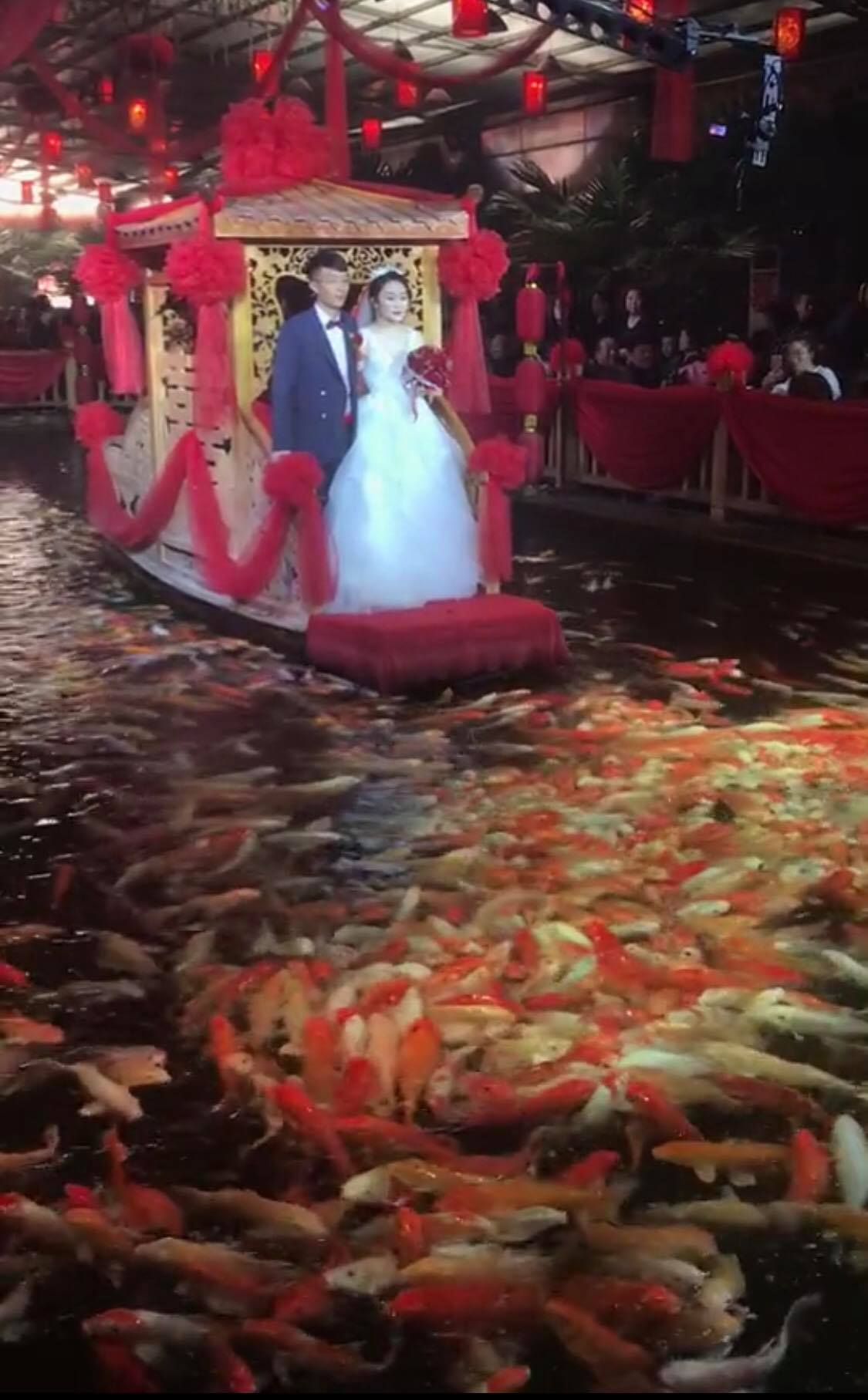 Mới đây, mạng xã hội đang truyền tay nhau đoạn clip một đám cưới cực kì độc, lạ: cô dâu - chú rể ra mắt các quan khách trên chiếc thuyền hoa giữa một hồ cá cảnh. Đám cưới này được cho là ở Trung Quốc.