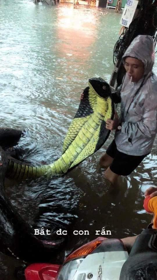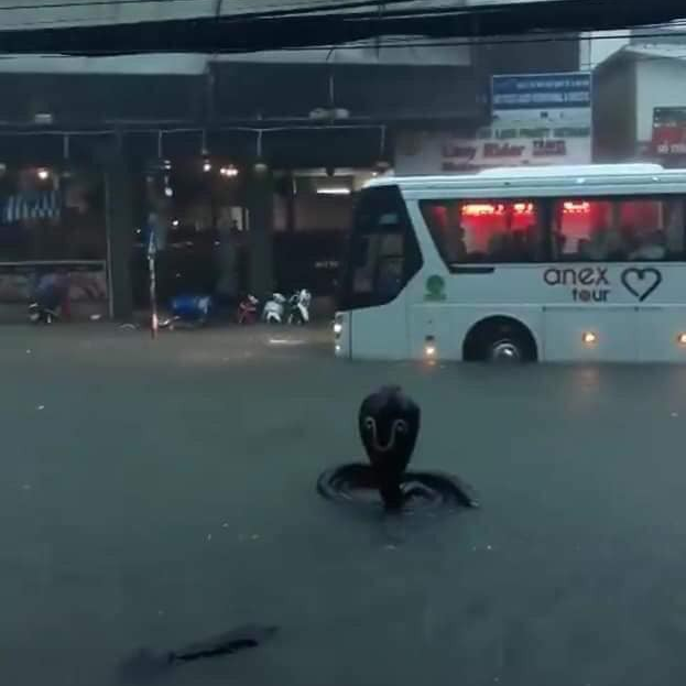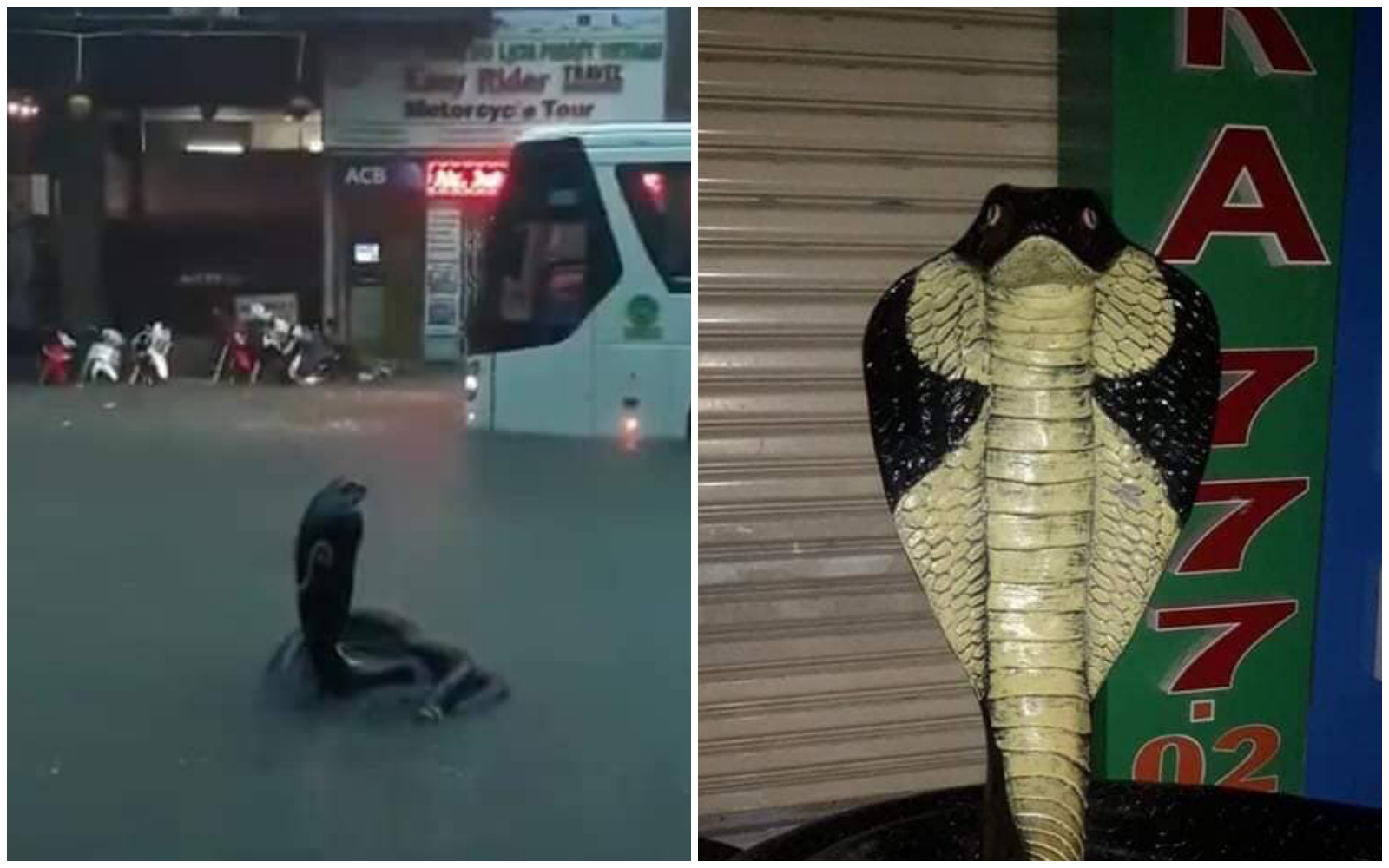 Hình ảnh này xuất hiện trên mạng xã hội vào hôm qua (18/11) khiến ai ai cũng hoảng hốt. Khi nước ngập ngang bánh xe cùng những đợt mưa lớn cứ ào ào, đâu đó là sạt lở đất thì hình ảnh con rắn hổ mang bành to ngoại cỡ lại bất chấp đứng ngóng giữa phố quả là ác mộng.
