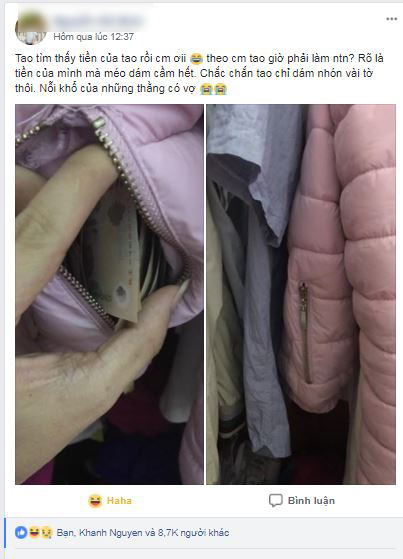 Ấy thế nên mới có chuyện, anh chồng sau khi tìm thấy nơi cất kho ngân quỹ của vợ, dù muốn thó lắm nhưng vẫn nên là chụp ảnh hỏi 500 anh em xem xử lí thế nào cho chắc. Kẻo vợ phát hiện, chắc bị cấm vận ăn chơi cả quý thì có mà xanh mặt. Nguyên văn chia sẻ của anh chồng đáng thương.
