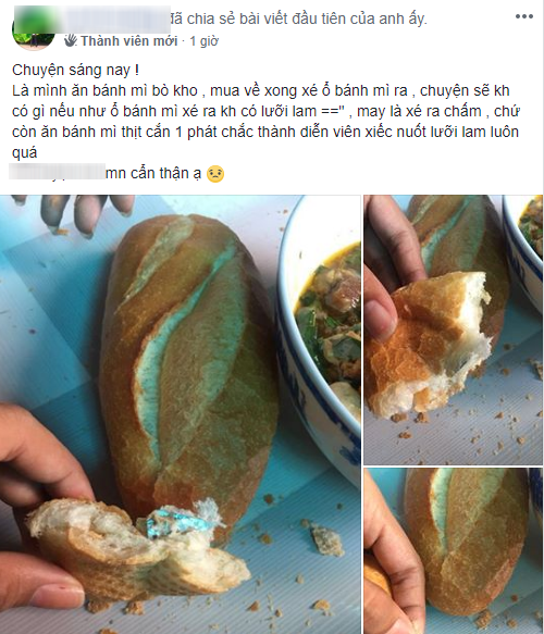 Tài khoản L.V.C cho biết: “Sáng nay, mình ăn bánh mì bò kho. Mua về xong xé ổ bánh mì ra. Chuyện sẽ không có gì nếu ổ bánh mì không có lưỡi lam. Mày xé ra chấm chứ cắn bánh mì chắc thành… diễn viên xiếc nuốt lưỡi lam luôn quá!”.