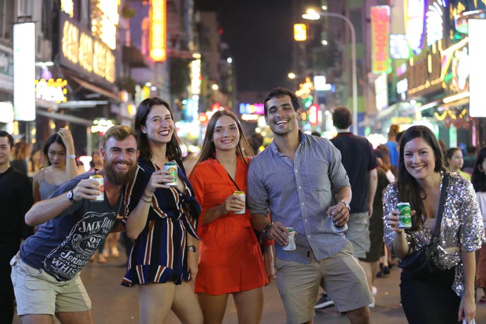 Đến khoảng 1h sáng, có thể bắt gặp bất kỳ một ông Tây nào đang cầm mic hát những bài hát quê hương họ trên chiếc loa thùng giữa phố, cầm trên tay xiên cá viên chiên và chào bất cứ ai đi ngang qua. Những màu sắc rộn ràng, tươi trẻ và không gian sầm uất khủng khiếp, đã khiến khách nước ngoài lạc vào đây và không nỡ bước chân ra chỉ sau khi trời đã sáng.