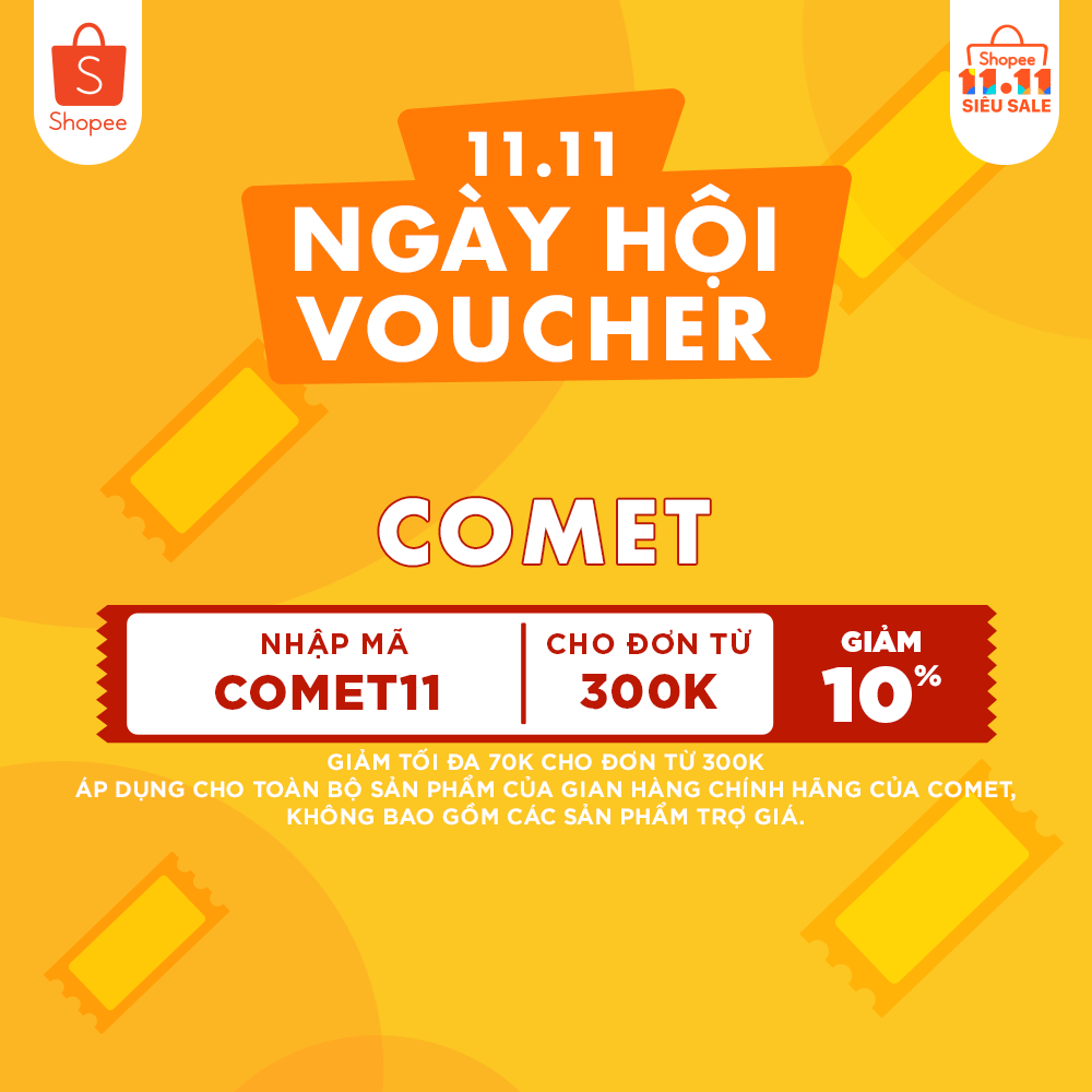 Nhập mã COMET11 để giảm thêm 10% (tối đa 70k) cho đơn hàng chỉ từ 300k, áp dụng cho toàn bộ sản phẩm của shop Comet “chính chủ” và không bao gồm các sản phẩm trợ giá. Hạn sử dụng đến hết ngày 29/10.