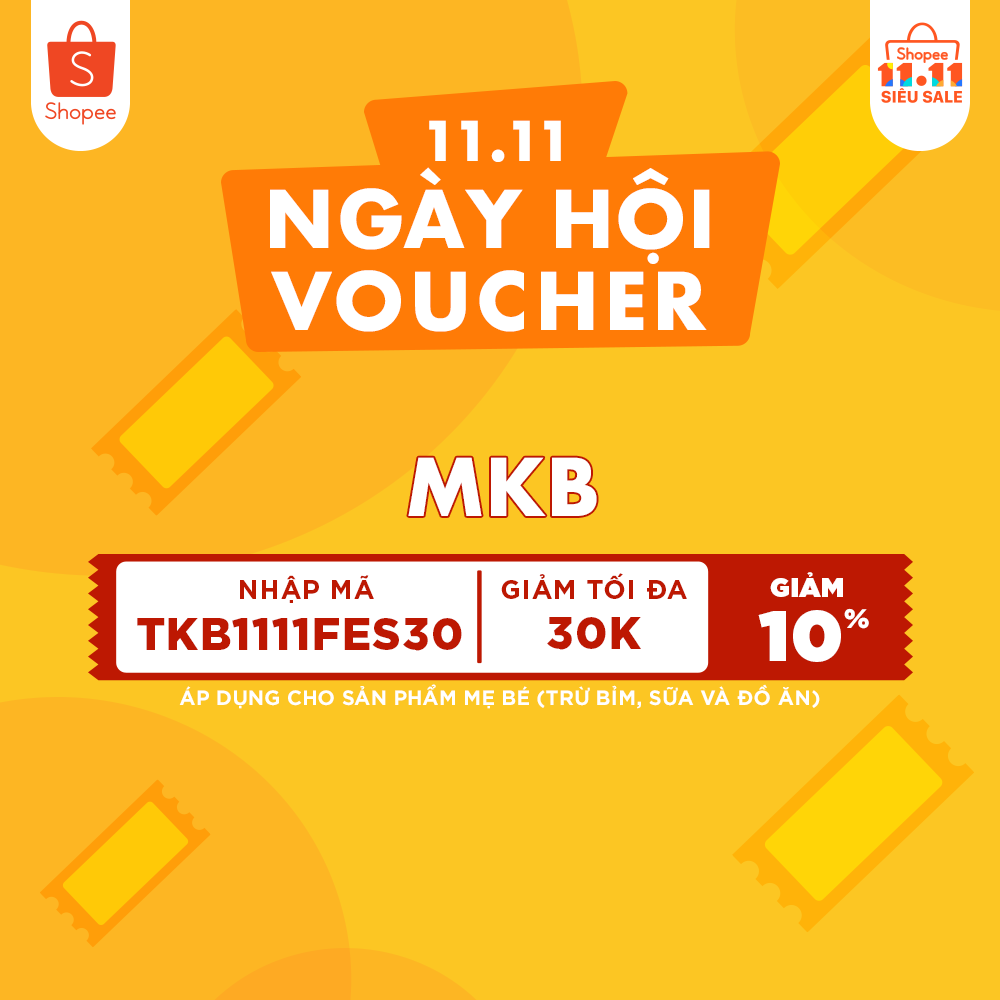 Mã TKB1111FES30 giảm thêm 10% (tối đa 30k) cho đơn hàng bất kỳ đối với sản phẩm Mẹ & Bé (trừ dòng hàng bỉm sữa và đồ ăn). Hạn sử dụng đến hết ngày 29/10.