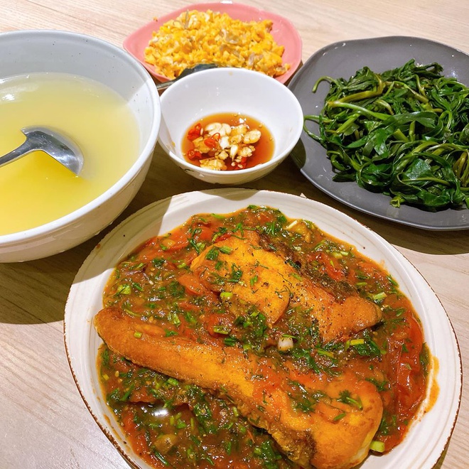 Ca sĩ Bích Phương cũng không ngần ngại khoe thành quả là mâm cơm đầy đủ dinh dưỡng gồm các món như: nấu cá sốt cà, rau muống luộc và trứng chiên. Được biết, giọng ca Bao giờ lấy chồng vốn được biết đến là một nữ công gia chánh của showbiz Việt. Thậm chí, Bích Phương từng được Hoa hậu Hương Giang khen ngợi về tài nghệ nấu nướng của mình.