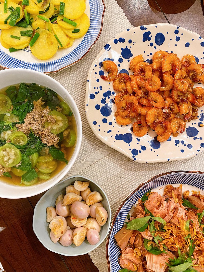Nổi tiếng là mỹ nhân khéo léo chuyện bếp núc, “ngọc nữ” Tăng Thanh Hà cũng tranh thủ chuẩn bị những món ăn, thức uống cho gia đình trong thời gian tránh dịch. Có thể thấy, mâm cơm của cô nàng rất phong phú với các món ăn đảm bảo thành phần dinh dưỡng như: tôm rang, canh mướp đến cá chiên một nắng đều được trang trí vô cùng đẹp mắt.