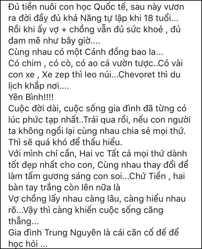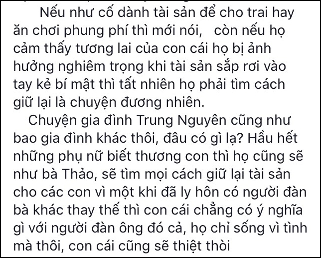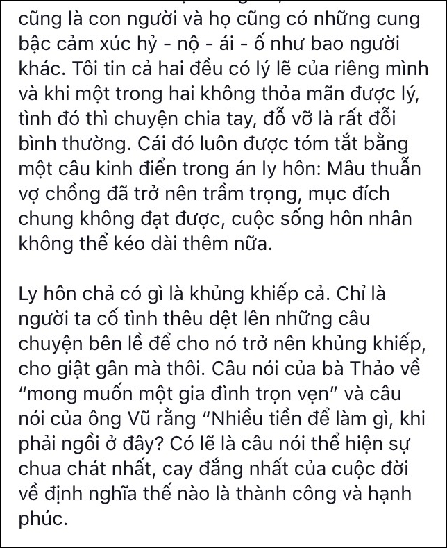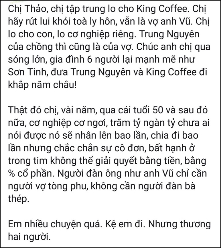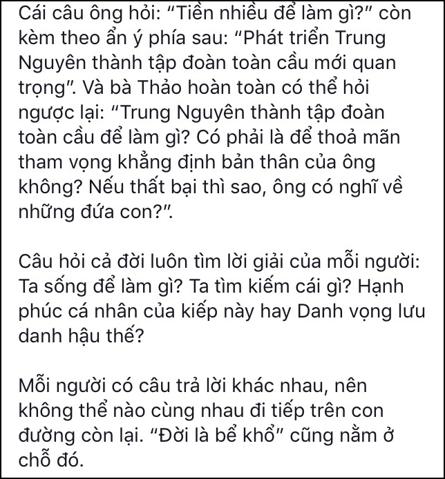 Ông chủ cafe Trung Nguyên cũng cho rằng bà Thảo phải sám hối và sống đúng với bản chất thật của mình. Những câu nói ngắn gọn và dứt khoát của ông Vũ đã chứng minh rằng quyết định ly hôn có lẽ đã được ông cân nhắc rất kỹ.