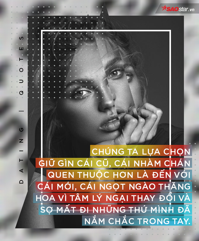 Chúng ta lựa chọn tình nghĩa đậm sâu thay vì tình yêu mong manh dễ vỡ. Chúng ta lựa chọn sự trống vắng trong tim hơn là mất đi gia đình - cái cột vốn cho ta cảm giác vững vàng. Chúng ta lựa chọn sự đau khổ của tình nhân thay vì sự oán trách của vợ/chồng hay phán xét xã hội vốn sẽ cho ta cảm giác tội lỗi nhiều hơn. Chúng ta lựa chọn giữ gìn danh tiếng thay vì bất chấp thị phi để không ảnh hưởng đến công danh sự nghiệp. Chúng ta lựa chọn sự bình yên thường nhật thay vì làm những điều phá cách phiêu lưu, vì ta muốn điều dễ hơn là thứ khó. Chúng ta lựa chọn giữ gìn cái cũ, cái nhàm chán quen thuộc hơn là đến với cái mới, cái ngọt ngào thăng hoa vì tâm lý ngại thay đổi và sợ mất đi những thứ mình đã nắm chắc trong tay. Nhất là khi chúng ta còn đang hồ nghi rằng cái mới thổn thức kia liệu thực sự có phải là một tình yêu sâu sắc, là một nửa đích thực, là cái tốt đẹp hơn cũ để chấp nhận đánh đổi?