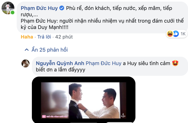 Trước đó, trong một bình luận trên mạng xã hội, Đức Huy cũng hé lộ chính anh là người đã bao trọn “combo” các khâu trong đám cưới Duy Mạnh như: “Phù rể, đón khách, tiếp nước, xếp mâm, tiếp rượu… Phạm Đức Huy: Người nhận nhiều nhiệm vụ nhất đám cưới thế kỷ của Duy Mạnh”…