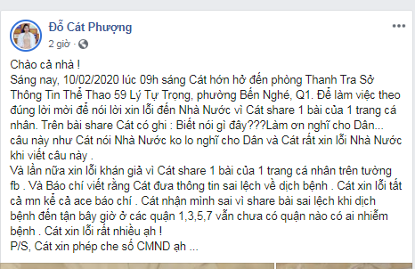 Sáng nay, 10/02/2020, lúc 9 giờ sáng, Cát hớn hở đến Phòng Thanh Tra của Sở Thông tin - Thể thao để làm việc theo đúng lời mời và nói lời xin lỗi đến Nhà Nước vì Cát đã chia sẻ một bài. Trên bài share Cát có ghi: “Biết nói gì đây? Làm ơn nghĩ cho dân”. Câu này Cát nói Nhà Nước không biết nghĩ cho dân và Cát rất xin lỗi Nhà Nước khi viết như vậy. .