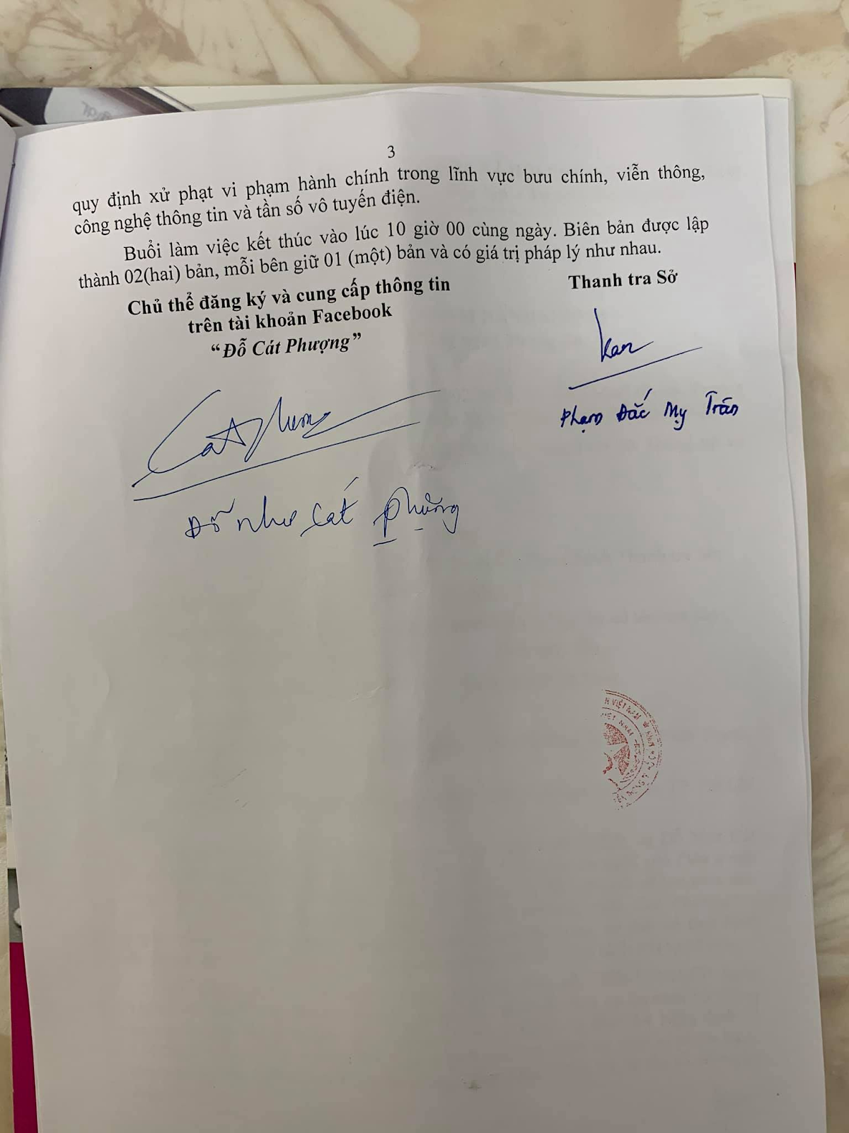 Trong biên bản làm việc, Sở Thông tin - Truyền thông TP HCM cho rằng bài chia sẻ trước đây của Cát Phượng gây ảnh hưởng xấu đến trật tự xã hội, vi phạm Điểm e, Khoản 1, Điều 5 Nghị định số 72/2013/NĐ-CP của Chính phủ về quản lý, cung cấp, sử dụng dịch vụ internet và thông tin mạng.