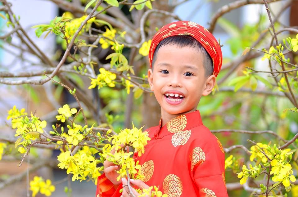 Bé trai 8 tuổi rạng rỡ trong bộ quần áo mới bên sắc mai vàng ngày Tết.