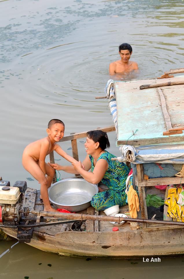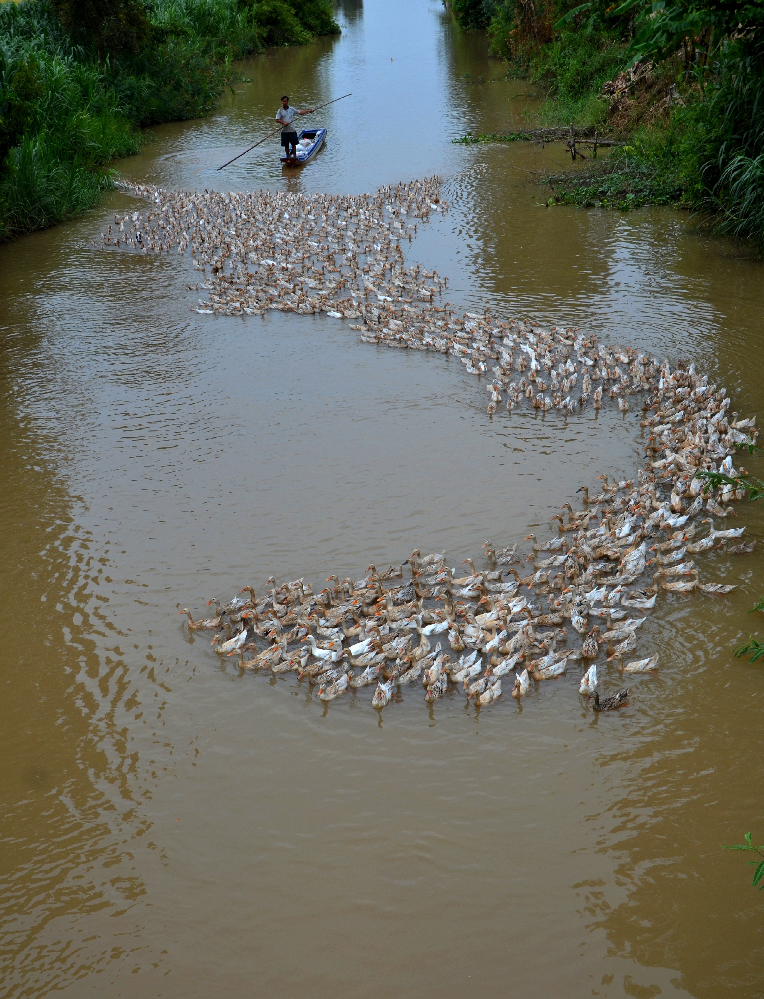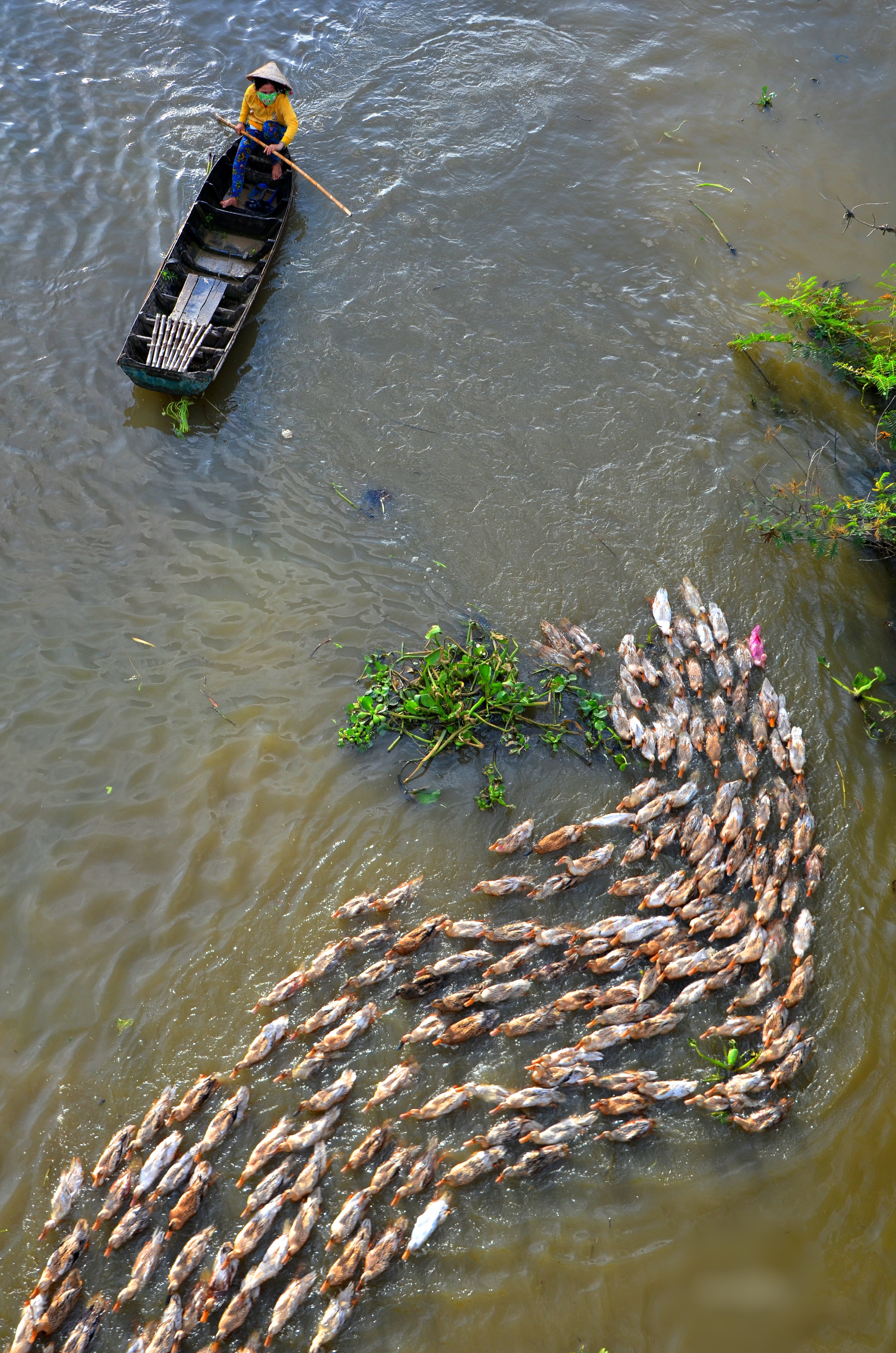 Bộ ảnh về miền Tây được thầy đặt tên là “Vịt chạy đồng”. Chùm ảnh ghi lại những cảnh mưu sinh trong mùa nước lũ của người dân miền Tây. Thầy Vượng Anh chia sẻ một về kỷ niệm vui khi chụp bộ ảnh này - cũng là bộ ảnh thầy thích nhất: “Lần đó, mình đứng trên cầu chụp hơn 100 tấm, nhưng bức ảnh thú vị nhất chính là cảnh đàn vịt tạo thành hình chữ S dưới lòng sông. Đặc biệt, lần nào chụp ảnh vịt chạy đồng, cũng được mấy người chăn vịt cũng mời nhậu và cho hột vịt đem về.