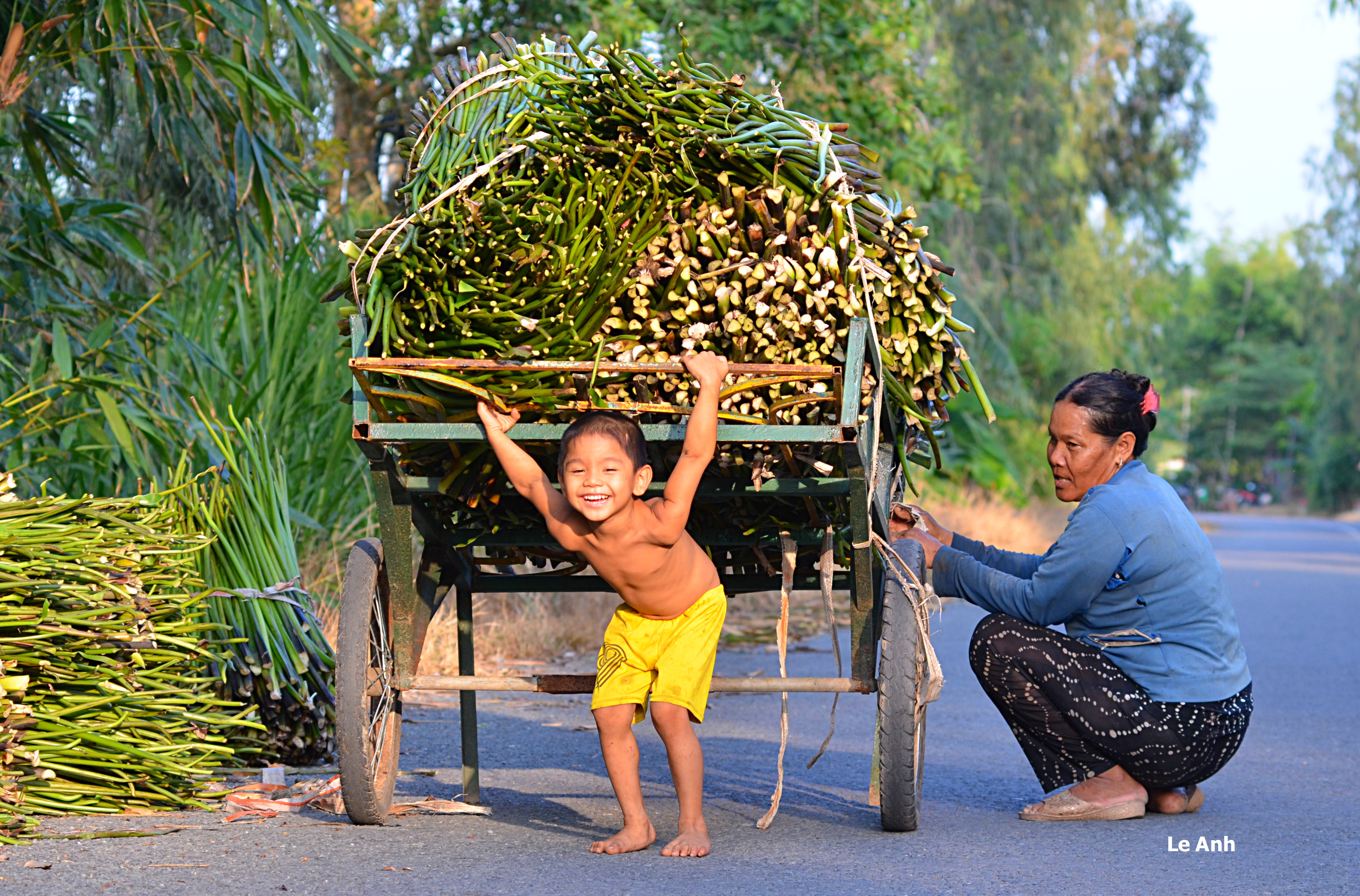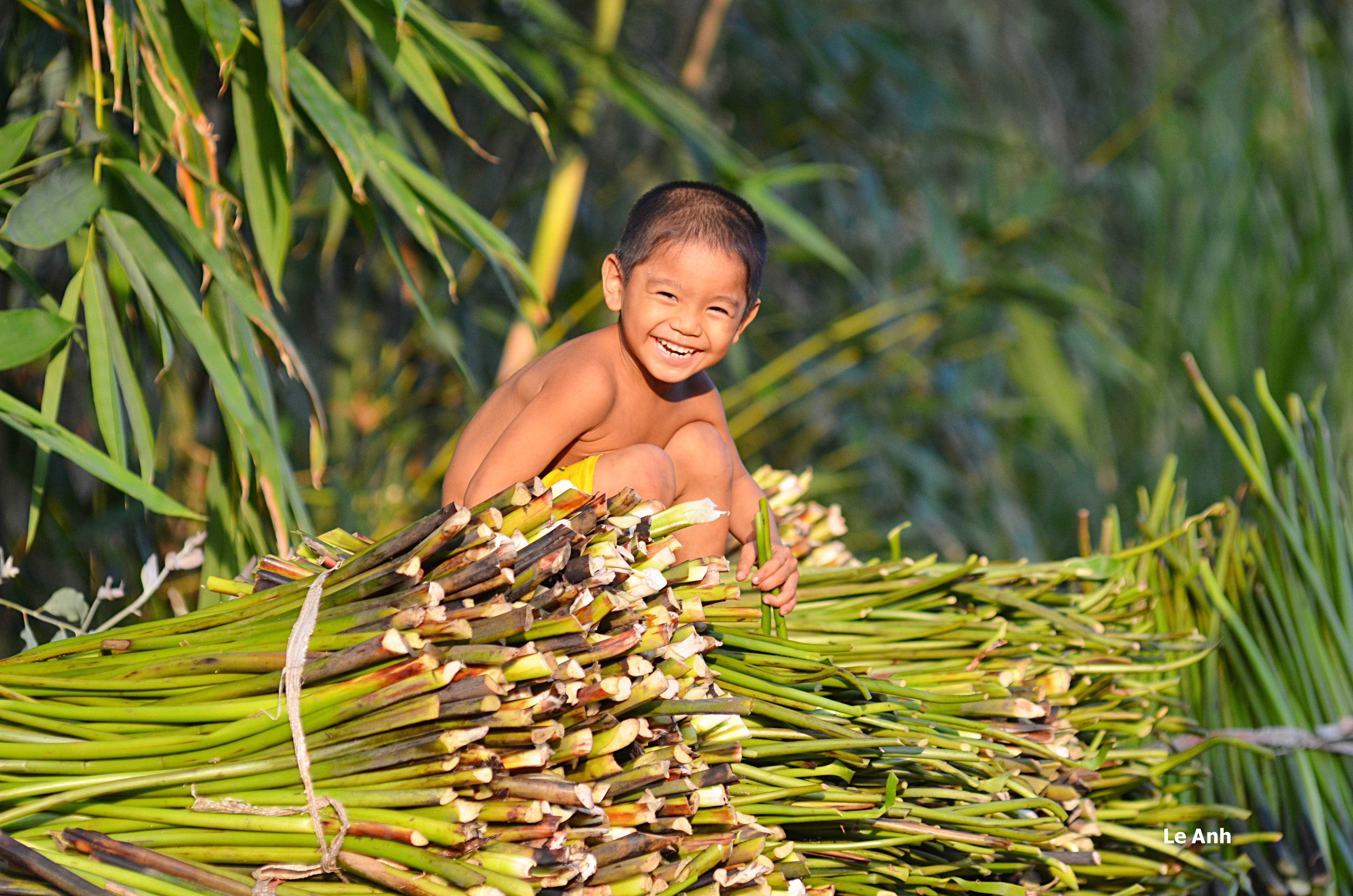 Một em nhỏ 5 tuổi giúp mẹ thu gom lục bình ở ĐồngTháp