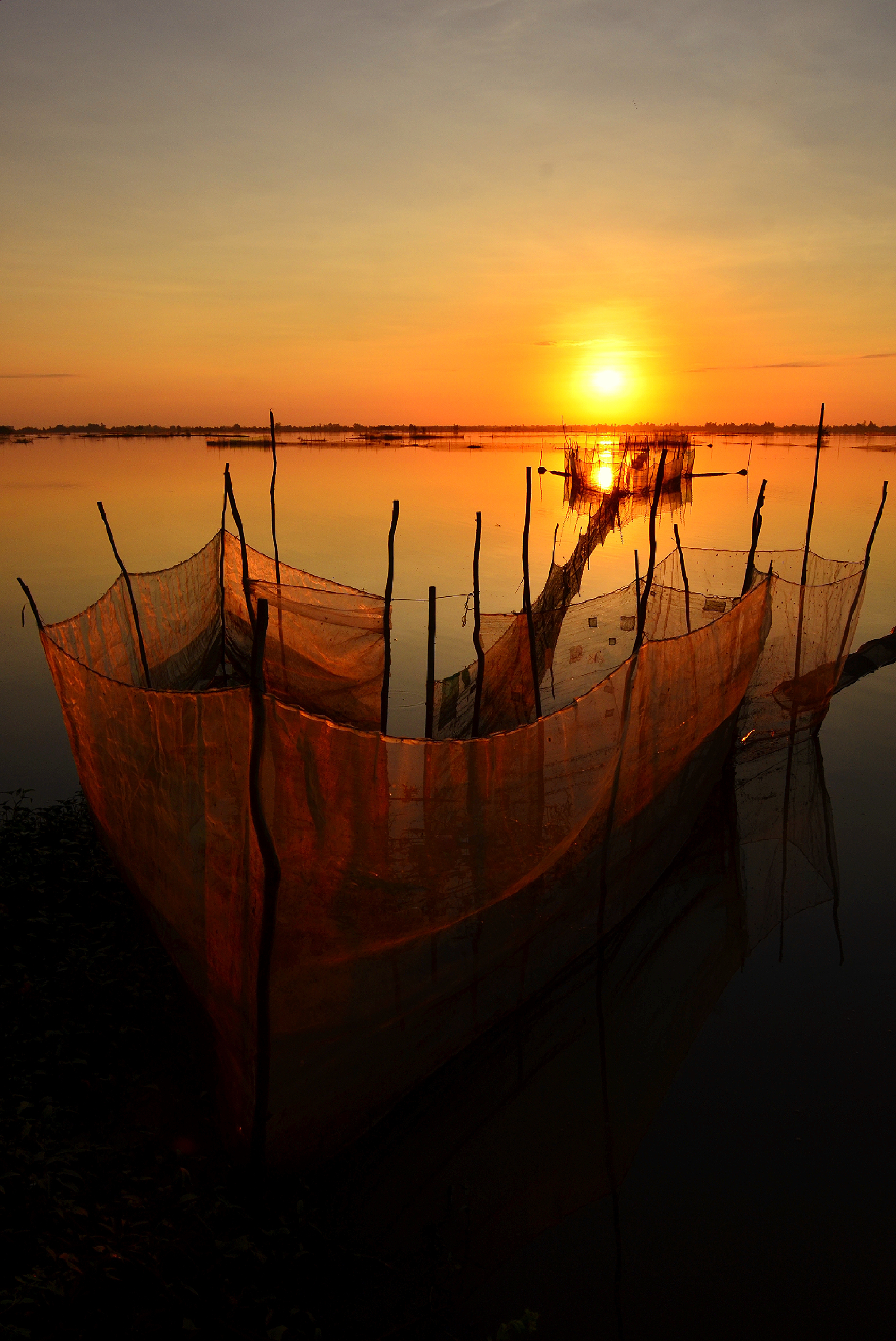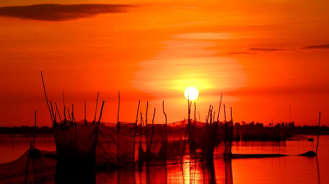 Cảnh hoàng hôn trên cánh đồng miền Tây mùa nước nổi như bức họa đồng quê đẹp nao lòng.