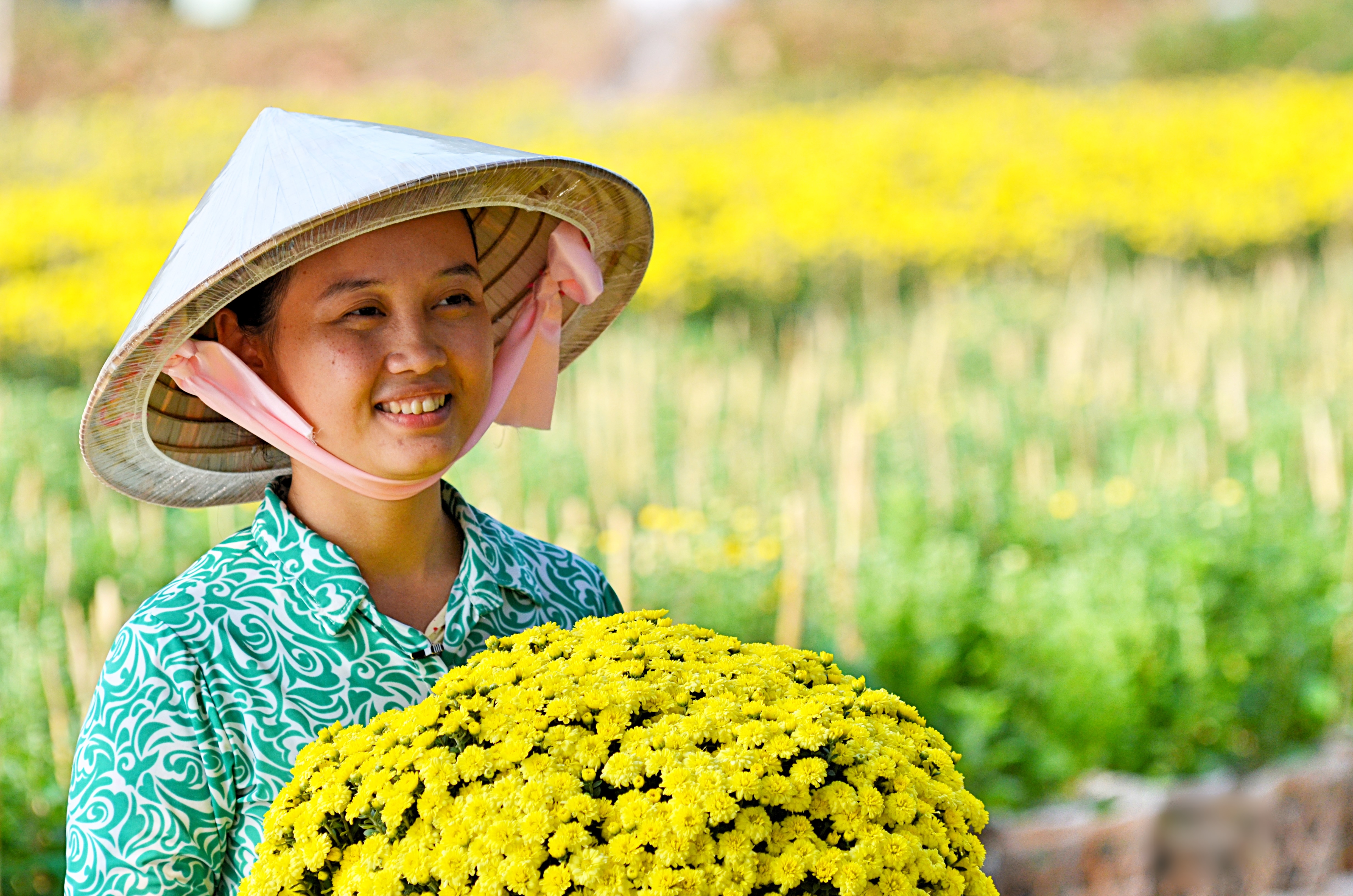Một người phụ nữ ở Làng Hoa Sa Đéc (Đồng Tháp) đang thu hoạch những chậu hoa cúc