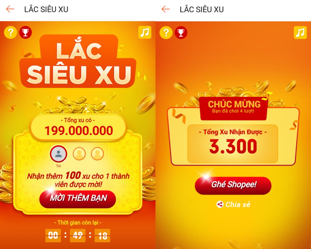 Game Lắc Siêu Xu cho phép tất cả mọi người khi đăng nhập tài khoản Shopee đều có thể tham gia. Mỗi người sẽ có một lượt chơi miễn phí, mỗi lượt chỉ 10s do đó lắc càng nhanh càng sung khả năng xu rơi càng nhiều.