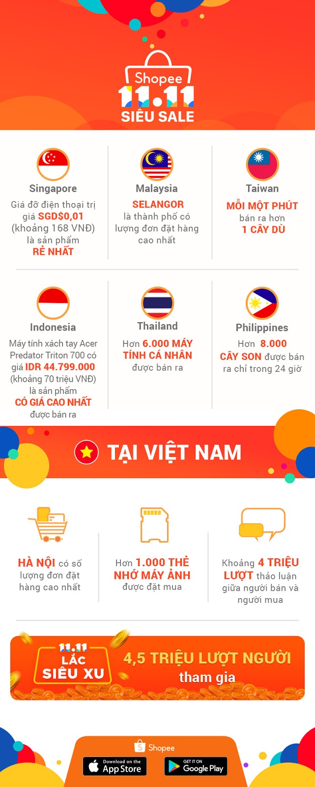 Shopee phá vỡ kỷ lục với con số hơn 11 triệu đơn hàng được giao dịch ngay trong ngày 11 tháng 11, tăng khoảng 4,5 lần so với cùng kỳ năm trước. Ngày hội 11.11 Shopee Siêu Sale thu hút hơn 42 triệu lượt truy cập và mua sắm tại nhiều ngành hàng. Số lượng sản phẩm cao nhất bán ra trong mỗi phút đạt hơn 58.000 sản phẩm.