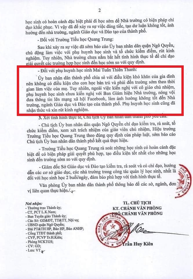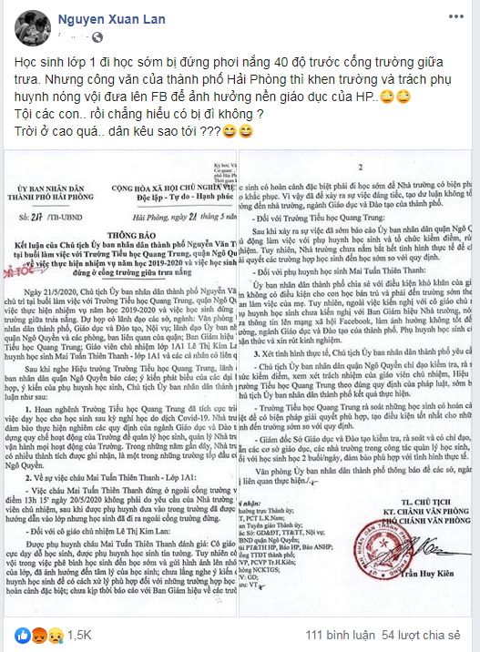 Trước đó, ngày 21/5, trên mạng xã hội lan truyền thông tin phản ánh của một phụ huynh học sinh lớp 1A1 Trường tiểu học Quang Trung, phường Vạn Mỹ, quận Ngô Quyền, TP Hải Phòng về việc con gái người này bị đứng ngoài cổng trường trong thời tiết nắng nóng vì đi học quá sớm.