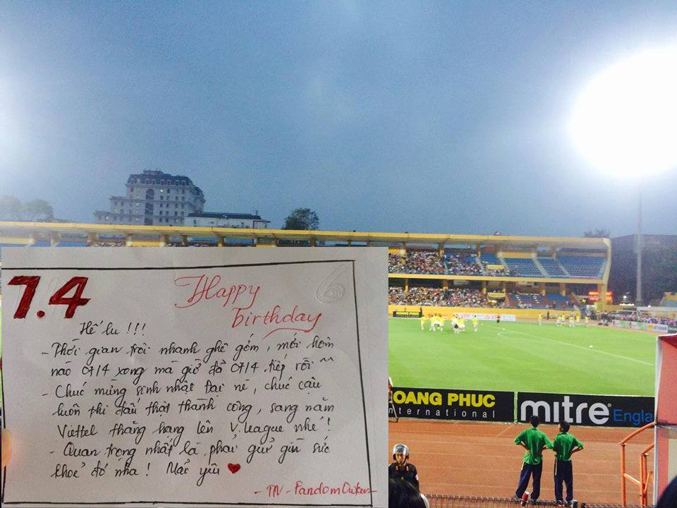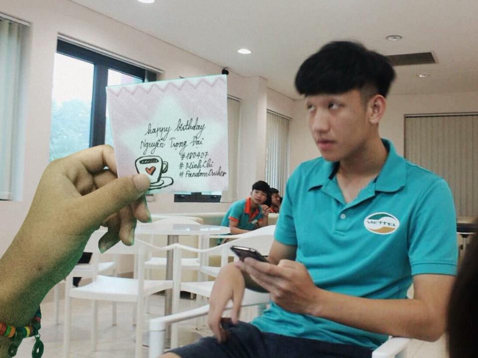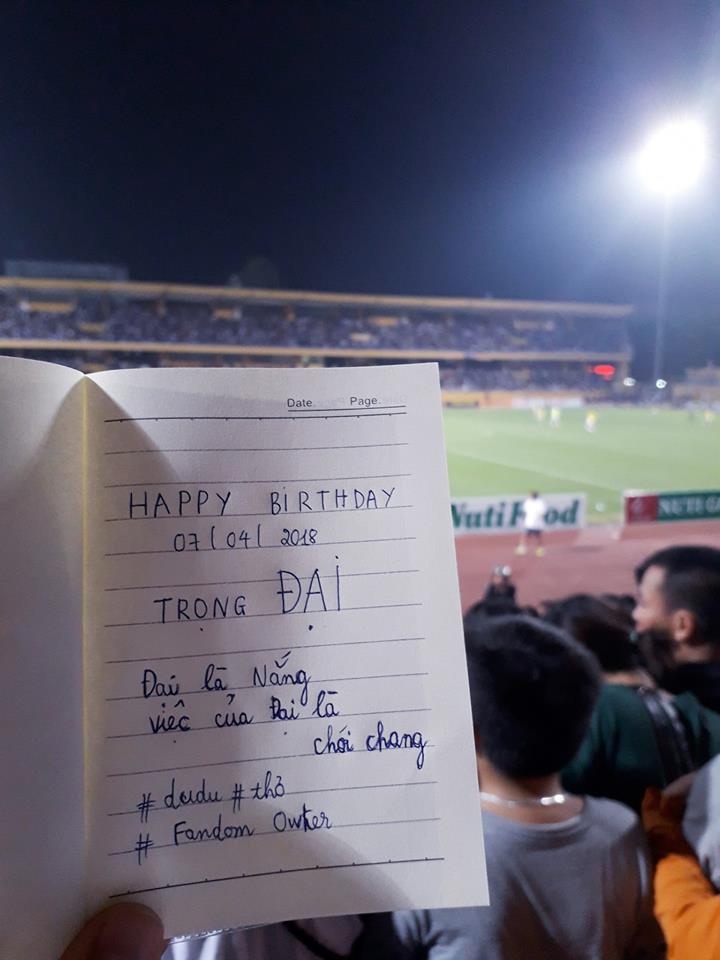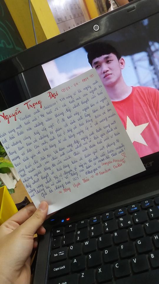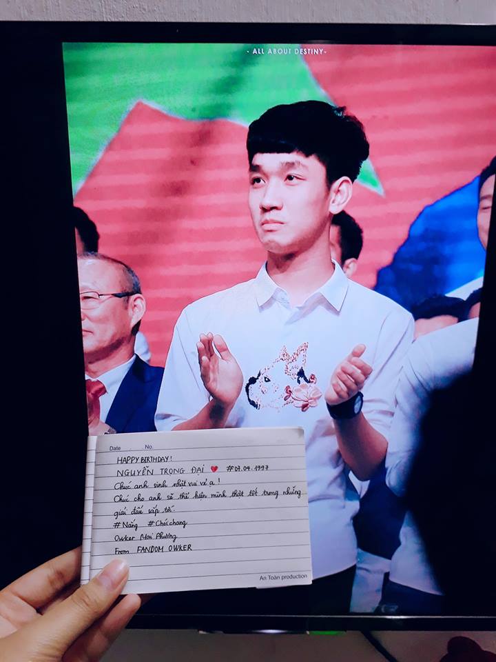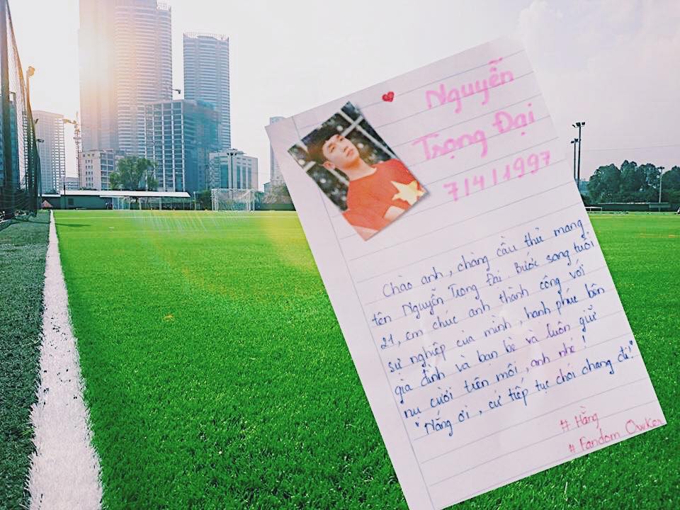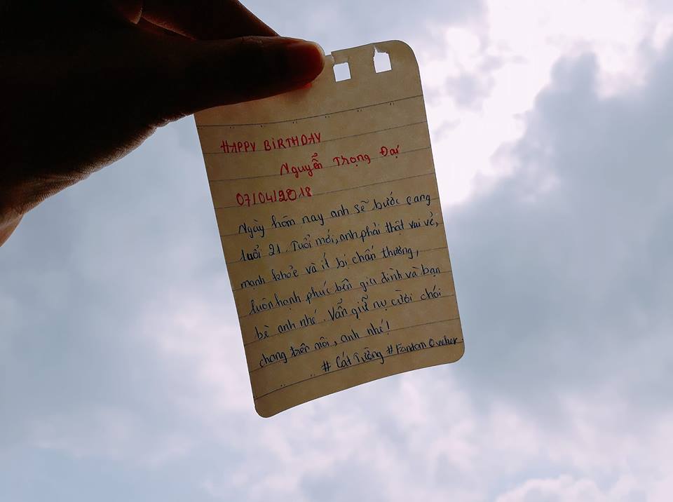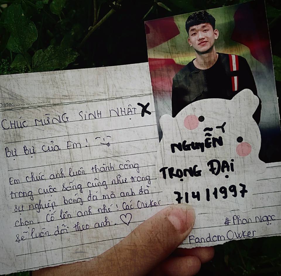 “Em biết đến anh Nắng qua một cách cũng rất nắng vậy. Chúc anh luôn cười vui vẻ và thật hạnh phúc”; “Tuổi 21 vui vẻ và ít bị chấn thương. Chúc anh Nắng luôn tỏa nắng chói chang” - Những lời chúc gửi đến Trọng Đại được các fan ghi lại trên giấy rồi chụp ảnh làm quà tặng chàng tiền vệ sinh năm 1997.