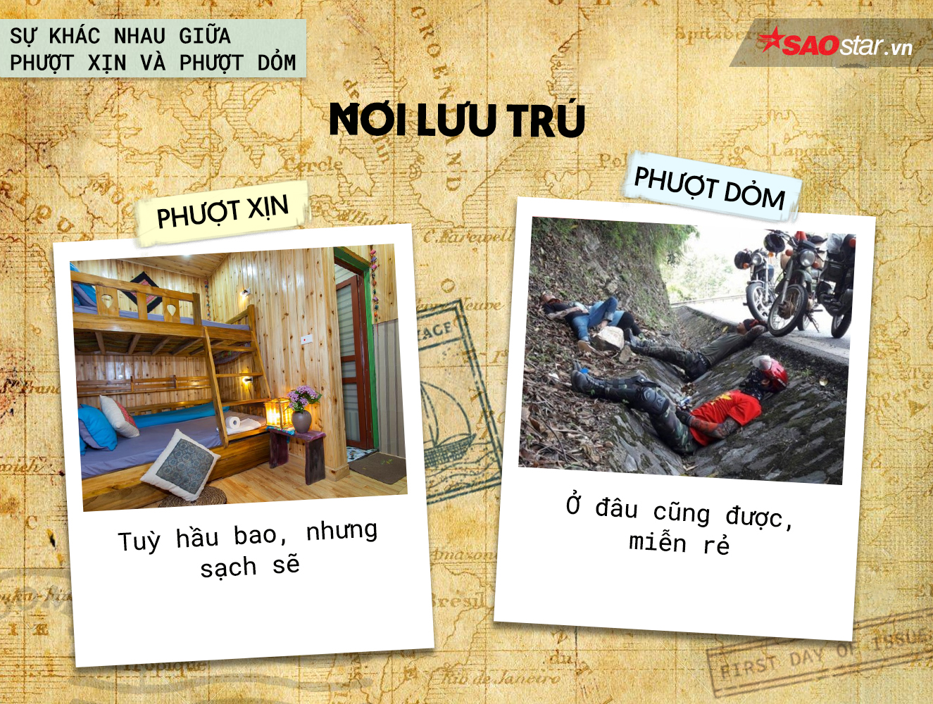 Nhiều tiền thì nhà nghỉ khách sạn, ít tiền thì xin lưu trú ở nhà dân, nhưng lúc nào Phượt xịn cũng sạch sẽ và giữ gìn cảnh quan. Còn đối với Phượt dởm, có thể ngủ bờ ngủ bụi cho tiết kiệm, nhưng không có chút ý thức giữ gìn vệ sinh môi trường chút nào.