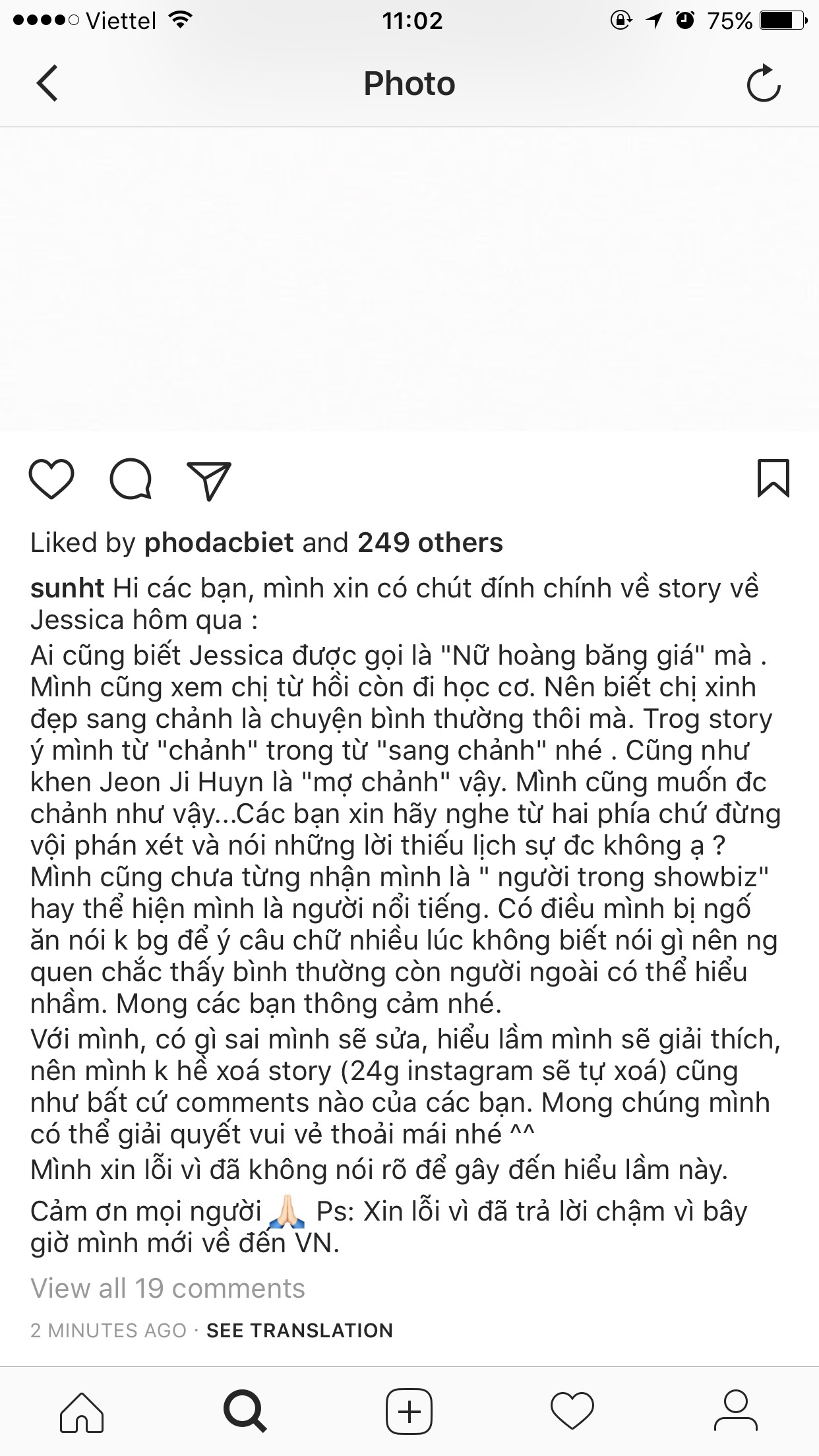 “Hi các bạn, mình xin có chút đính chính về story về Jessica hôm qua: Ai cũng biết Jessica được gọi là “Nữ hoàng băng giá” mà. Mình cũng xem chị từ hồi còn đi học cơ. Nên biết chị xinh đẹp sang chảnh là chuyện bình thường thôi mà. Trong story ý mình từ “chảnh” trong từ “sang chảnh” nhé. Cũng như khen Jeon Ji Huyn là “mợ chảnh” vậy. Mình cũng muốn được chảnh như vậy…Các bạn xin hãy nghe từ hai phía chứ đừng vội phán xét và nói những lời thiếu lịch sự được không ạ? Mình cũng chưa từng nhận mình là “người trong showbiz” hay thể hiện mình là người nổi tiếng. Có điều mình bị ngố ăn nói không bao giờ để ý câu chữ nhiều lúc không biết nói gì nên người quen chắc thấy bình thường còn người ngoài có thể hiểu nhầm. Mong các bạn thông cảm nhé. Với mình, có gì sai mình sẽ sửa, hiểu lầm mình sẽ giải thích, nên mình không hề xóa story (24h instagram sẽ tự xóa) cũng như bất cứ comment nào của các bạn. Mong chúng mình có thể giải quyết vui vẻ và thoải mái nhé. Mình xin lỗi vì đã không nói rõ để gây đến hiểu lầm này. Cám ơn mọi người. Ps: Xin lỗi vì đã trả lời chậm vì bây giờ mình mới về đến VN”.