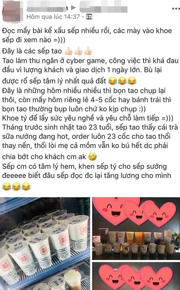 Theo đó, trong bài viết, cô bạn Nguyễn Thái An (SN 1996, Hà Nội), đã khoe vị sếp “tâm lý nhất quả đất” của mình, thường xuyên mua trà sữa, đồ ăn để “tặng” nhân viên. Cứ hễ mỗi lần có món gì mới hot là sếp lại mua ngay về cho các nhân viên cùng thưởng thức…