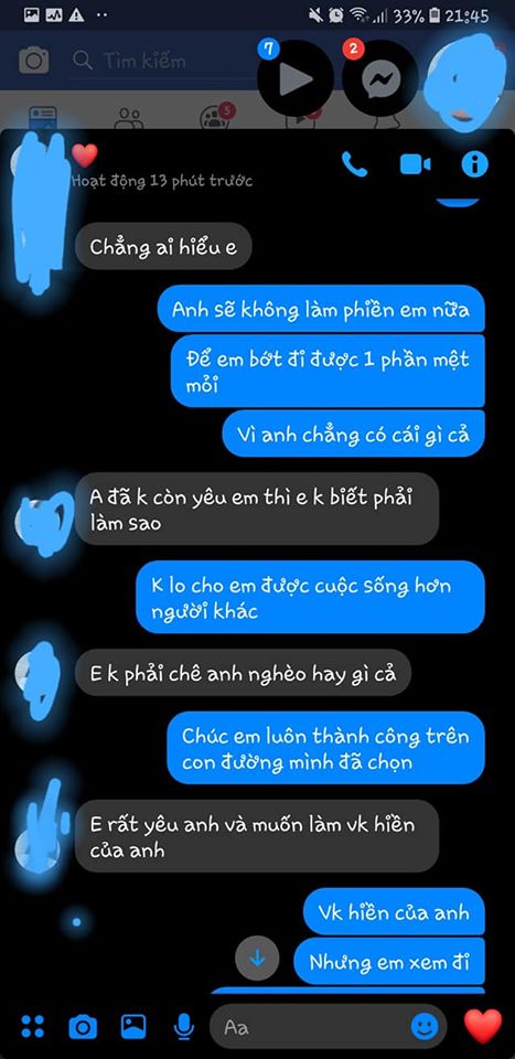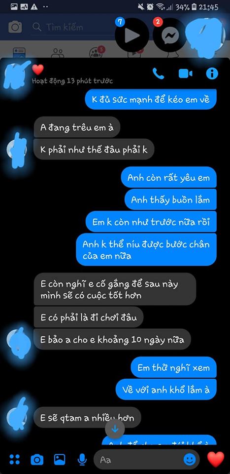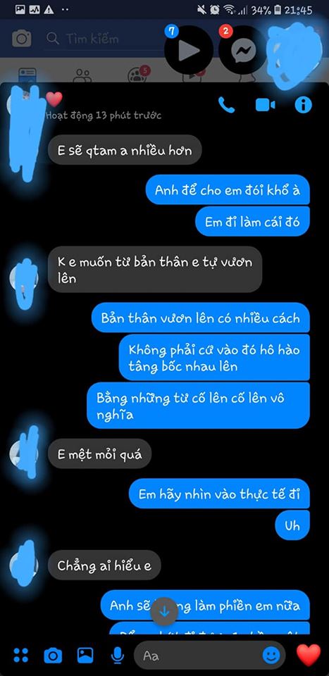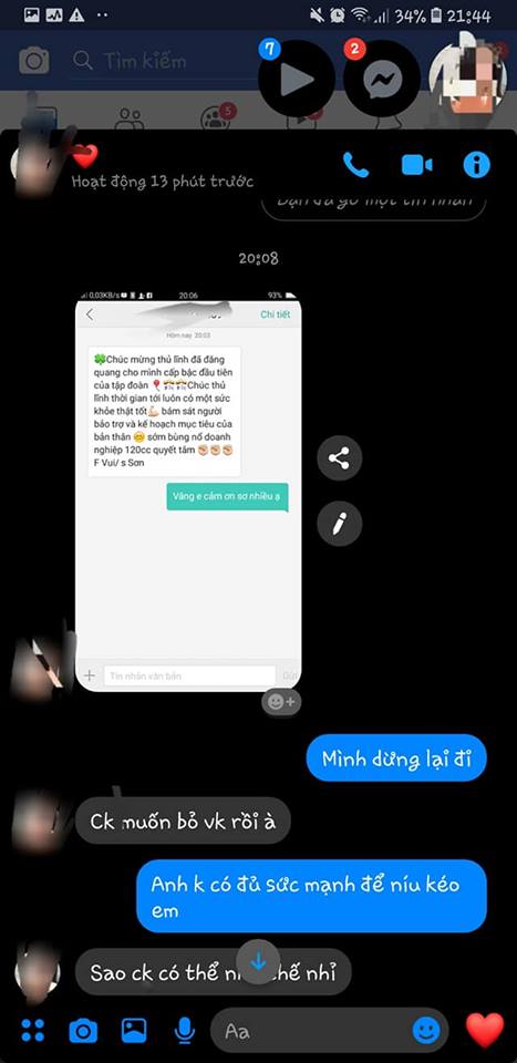 Kèm theo bài đăng là loạt hình ảnh chụp tin nhắn giữa hai người. Theo đó, chàng trai nói lời chia tay và bày tỏ sự bất lực khi không thể kéo cô gái ra khỏi tổ chức đa cấp. Về phía cô gái lại cho rằng, cô đang cố gắng để đem đến cuộc sống tốt đẹp hơn cho cả hai người, đồng thời cũng trách không có ai hiểu mình.