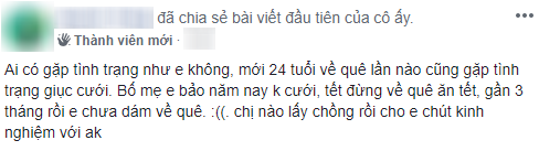 Tài khoản Q.T viết: “Ai có gặp tình trạng như mình không? Mới 24 tuổi về quê lần nào cũng gặp tình trạng giục cưới. Bố mẹ bảo năm nay không cưới, Tết đừng về quê ăn Tết. Gần 3 tháng rồi mình chưa dám về quê. Chị nào lấy chồng rồi cho mình chút kinh nghiệm với ạ”.