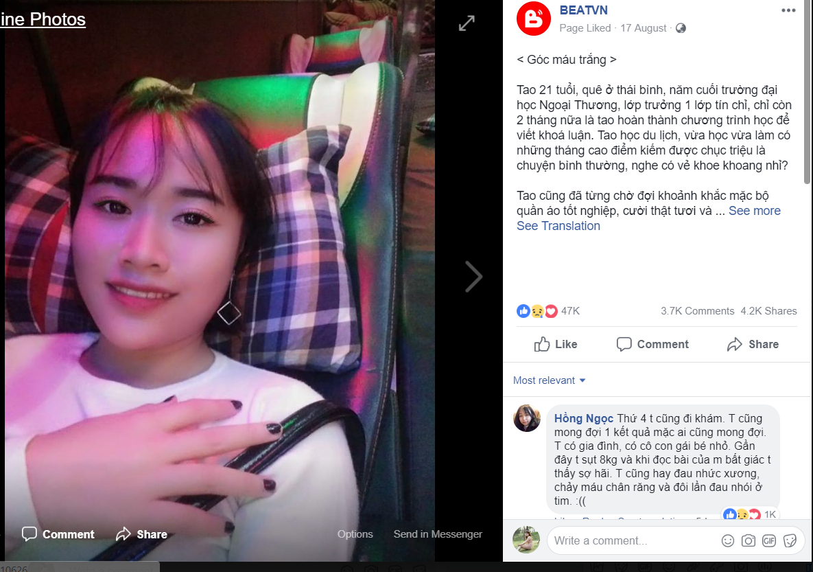 Qua tìm hiểu, chúng tôi được biết bức tâm thư trên là của bạn Nguyễn Thị Vân Anh (21 tuổi, quê Thái Bình). Hiện tại, Vân Anh đang điều trị hóa chất tại bệnh viện Huyết học & Truyền máu Trung ương.