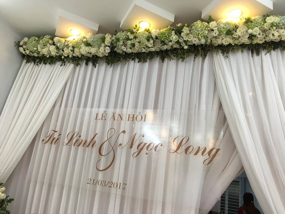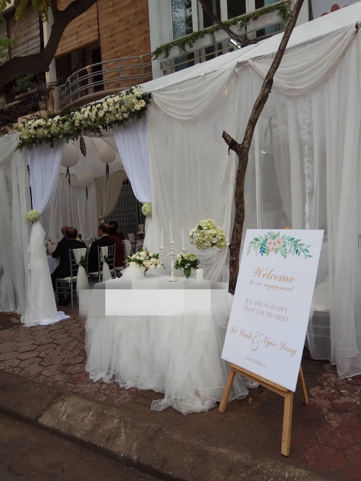 Hội trường lễ ăn hỏi được trang trí bằng tông màu trắng tinh khiết. Ảnh: Beat