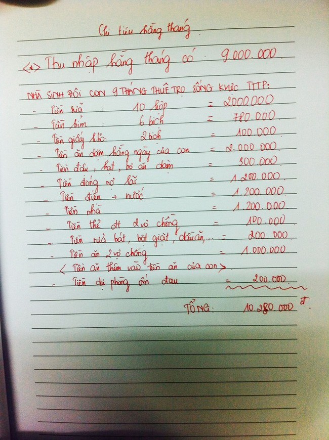 Mới đây, người mẹ trẻ có tài khoản T.B đã đăng bài chia sẻ khoản thu chi của gia đình mình. Điều đáng nói, thu nhập của chồng chỉ có 9 triệu nhưng người mẹ này luôn chi hơn 10 triệu.