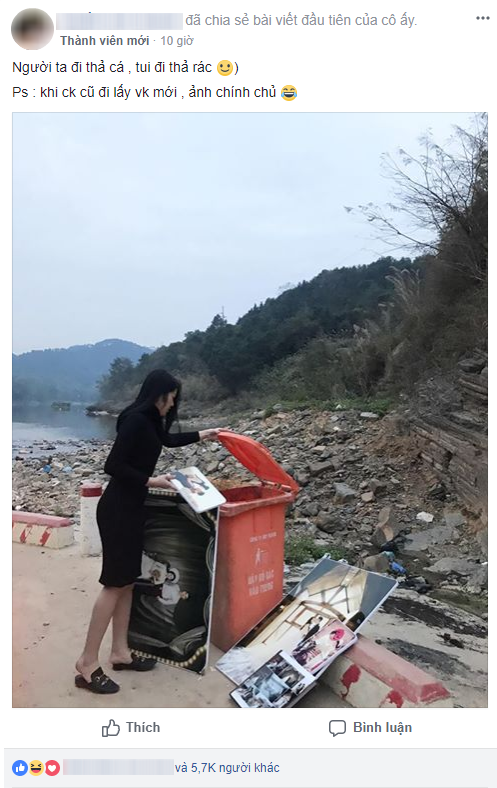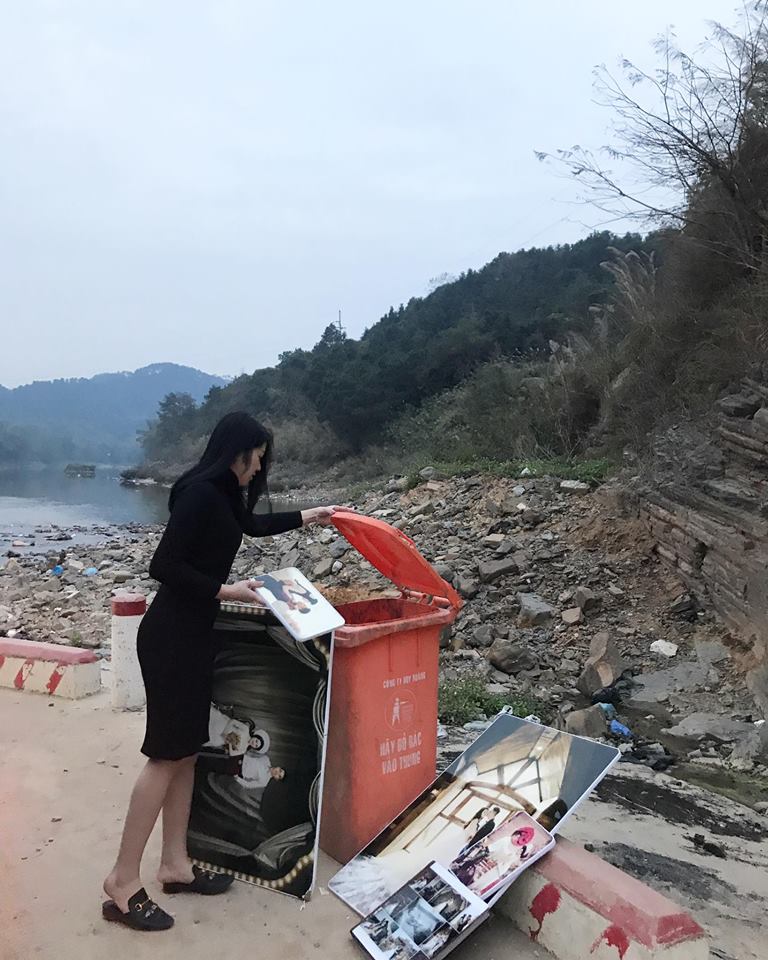 Ngày hôm nay, người dân cả nước đang tất bật làm mâm cơm cúng ông Công, ông Táo thì cô nàng H.H.A lại cặm cụi thu vén kỷ vật với chồng cũ đem đi bỏ. H.H.A chia sẻ: “Người ta đi thả cá, tôi đi thả rác. The end!“, kèm với hình ảnh mình đang cầm những bức ảnh cưới vứt vào thùng rác.