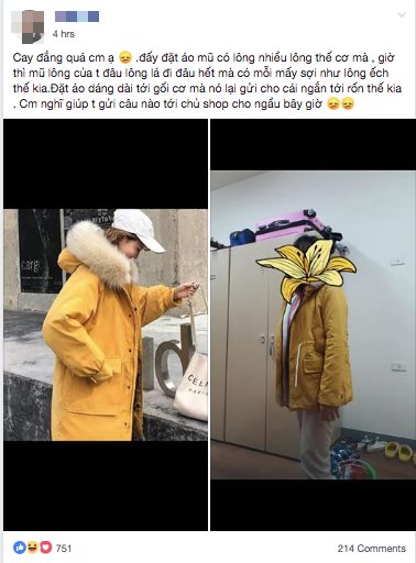 Cụ thể chuyện là cô gái này đặt mua một chiếc áo khoác về mặc tết, đặc điểm cô thích nhất chính là cái mũ rộng vành lông và chiều dài qua mông tiện lợi cho di chuyển giữ ấm, bởi vậy không chần chừ, cô gái đặt lấy chiếc áo đó. Nhưng cực chẳng đã, lúc hàng về tay, cô gái thẫn thờ vì áo ở ngoài khác hình đăng trên mạng một trời một vực: không mũ, không lông và cũng không có chiều dài qua mông. Thay vào đó là chiếc áo nhăn nhúm, màu vàng xỉn.