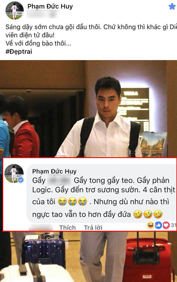 Tuy nhiên, chưa kịp thể hiện sự lo lắng quan tâm dành cho anh chàng thì người hâm mộ đã té ngửa vì một bình luận lầy lội của cầu thủ này nên dưới bức ảnh có caption: “Sáng dậy sớm chưa gội đầu thôi. Chứ không thì khác gì diễn viên điện tử đâu!”.