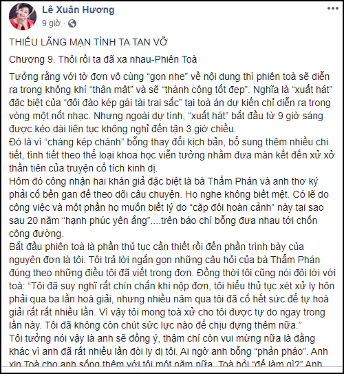 Sau 8 chương kể về cuộc sống hôn nhân chẳng khác gì “địa ngục” với nam MC Thanh Bạch, mới đây, Xuân Hương tiếp tục cho ra chương 9 kể chi tiết về quá trình ly hôn, đấu tố tại toà của cả hai.