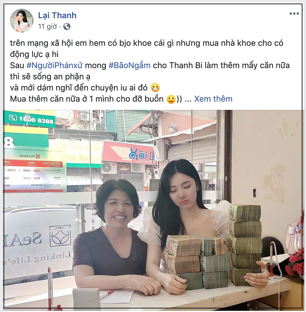 Cô viết: ”Trên mạng xã hội em không có bao giờ khoe cái gì nhưng mua nhà thì khoe cho có động lực ạ. Sau Người Phán Xử, mong Bão Ngầm cho Thanh Bi làm thêm mấy căn nữa thì sẽ sống an phận và mới dám nghĩ đến chuyện yêu ai đó. Mua thêm căn nữa ở 1 mình cho đỡ buồn. Chính chủ sổ đỏ tiếp đã về tay Thanh Bi”