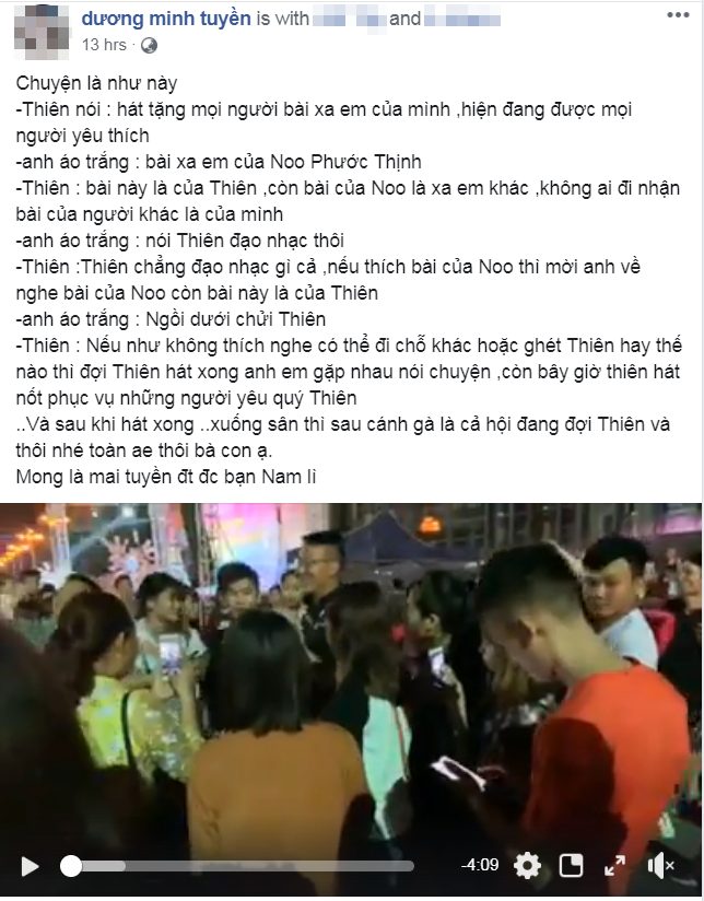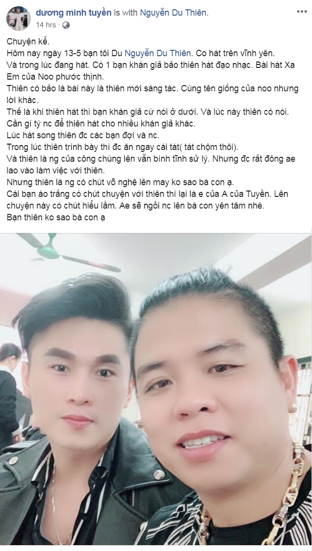 Cụ thể, Dương Minh Tuyền, cho biết ẩu đả xảy ra do khán giả nam có lời lẽ khiêu khích ca sĩ Du Thiên. Dù đã chia sẻ “Xa em” trùng tên với bài hát của ca sĩ Noo Phước Thịnh và chỉ hát bài hát của mình, nhưng nhóm thanh niên vẫn khẳng định Du Thiên đạo nhạc và giữa hai bên xảy ra lời qua tiếng lại.
