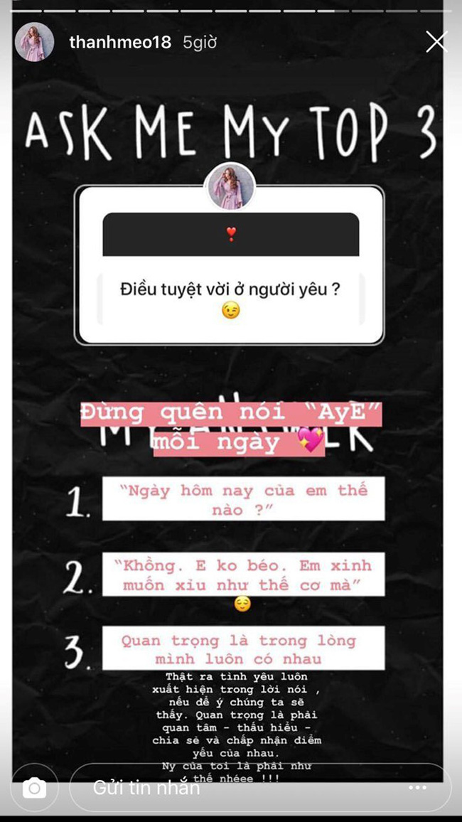 Ngoài ra, cô nàng còn chia sẻ điều tuyệt vời ở người yêu là “đừng quên nói anh yêu em mỗi ngày”, “luôn hỏi ngày hôm nay của em như thế nào”, “không, em không béo, em xinh muốn xỉu thế kia cơ mà”, “quan trọng là trong lòng mình luôn có nhau”. Cô bạn còn chia sẻ thêm: “thật ra tình yêu luôn xuất hiện trong lời nói, nếu để ý chúng ta sẽ thấy. Quan trọng là phải quan tâm, thấu hiểu, chia sẻ và chấp nhận điểm yếu của nhau”.