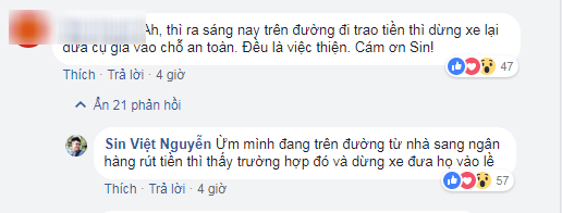 Trên trang cá nhân của mình, chàng thanh niên còn cho biết, sau khi đưa cụ già qua đường an toàn, anh tặng cụ một số tiền và dặn dò cụ không nên ngồi giữa đường vì rất nguy hiểm. Thậm chí, anh còn ngỏ lời mời cụ già đi ăn nhưng cụ già đã từ chối.
