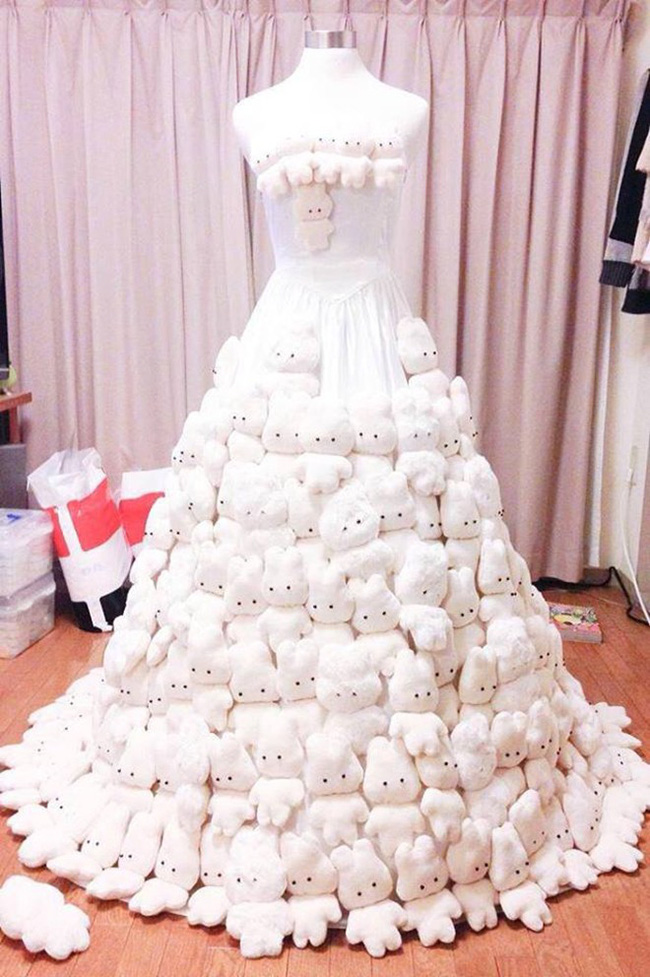 Mới đây, trên một diễn đàn đông thành viên xuất hiện bài viết nói về việc chú rể dành cả tháng trời để thiết kế, may vá chiếc váy cưới cho cô dâu của mình. Hình ảnh chiếc váy cưới được gắn đầy gấu bông khiến 500 chị em ai cũng xiêu lòng.