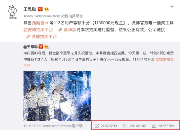Nhân dịp sự kiện IG vô địch thế giới, vào ngày 11/11, tỷ phú Vương Tư Thông đã trao giải cho một chương trình rút thăm trúng thưởng may mắn trên trang mạng xã hội Weibo để ăn mừng.